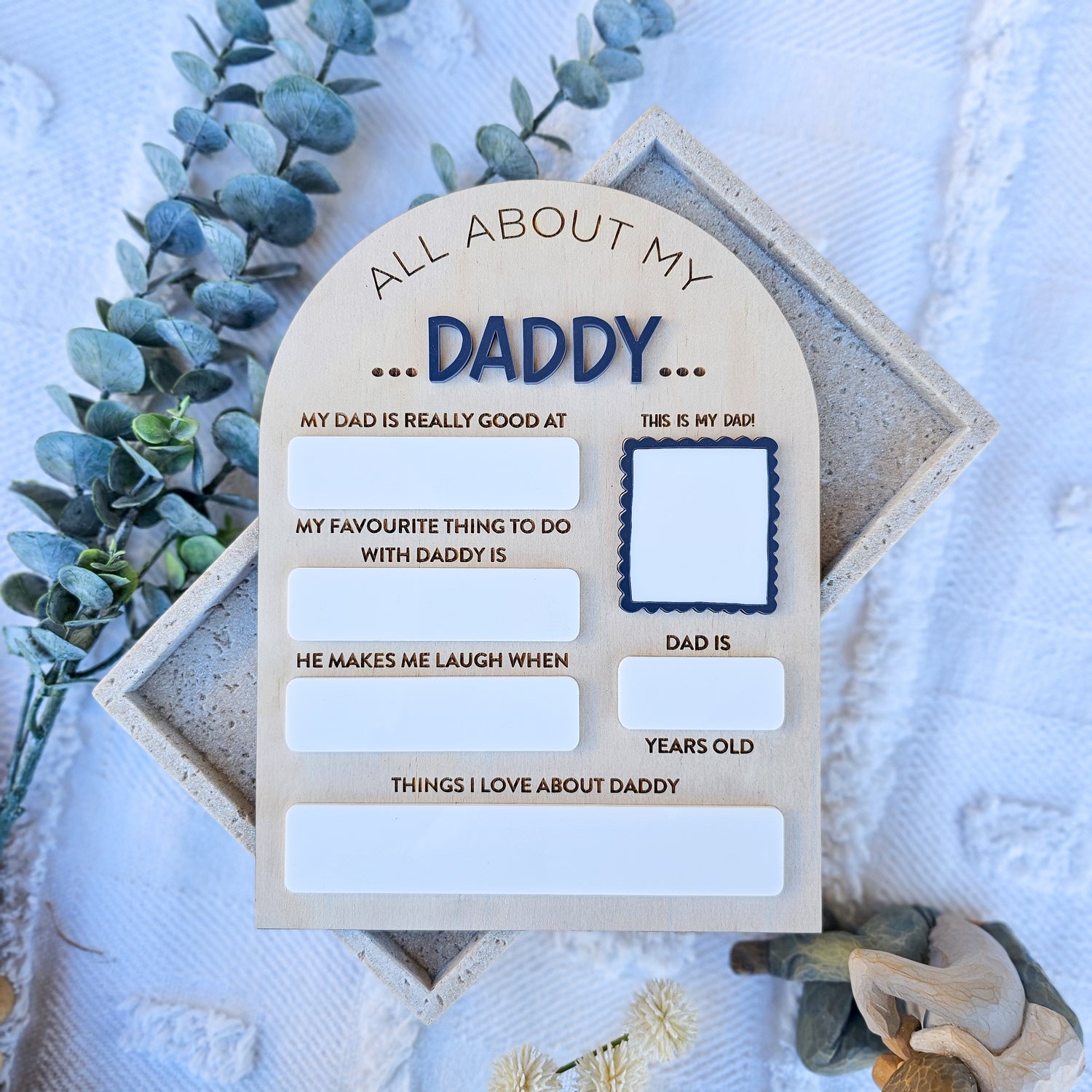 Our all about Dad plaque is a questionnaire for your little ones to answer about the man in their life. Featuring a reusable acrylic surface, your child can fill in the questionnaire and then later wipe off. The perfect keepsake gift that can be used for years to come
