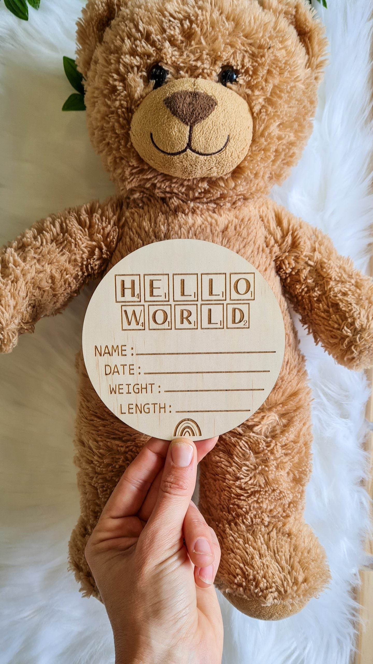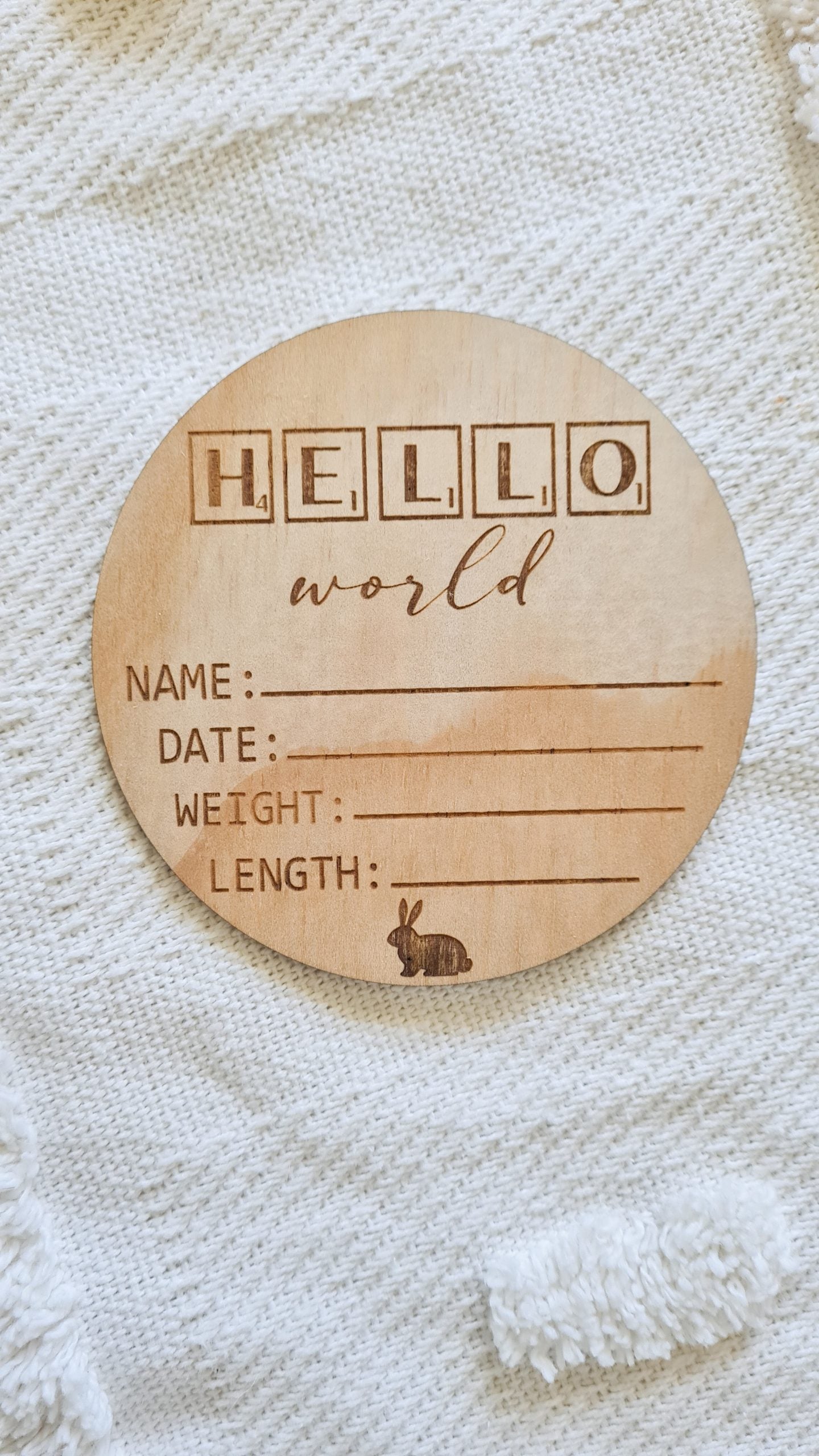 Announce your little loves arrival with our unique engraved 'Hello World' Disc. A beautiful way to share the announcement with your friends & family and then doubles as a cherished & personalised nursery piece.