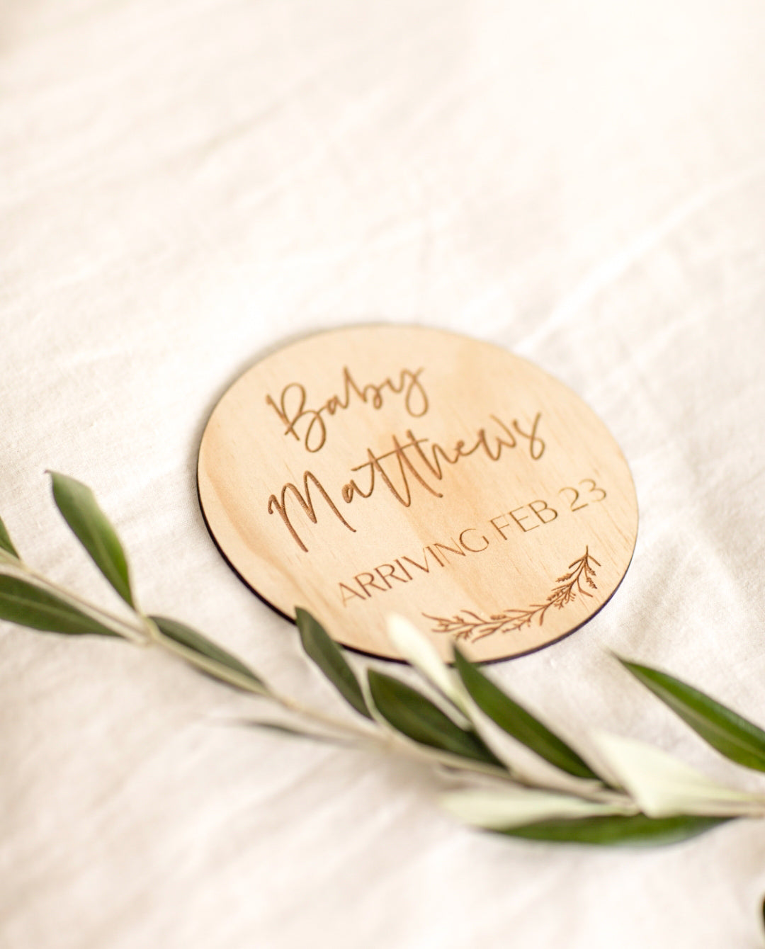 Featuring a 15cm engraved timber disc to announce your pregnancy.