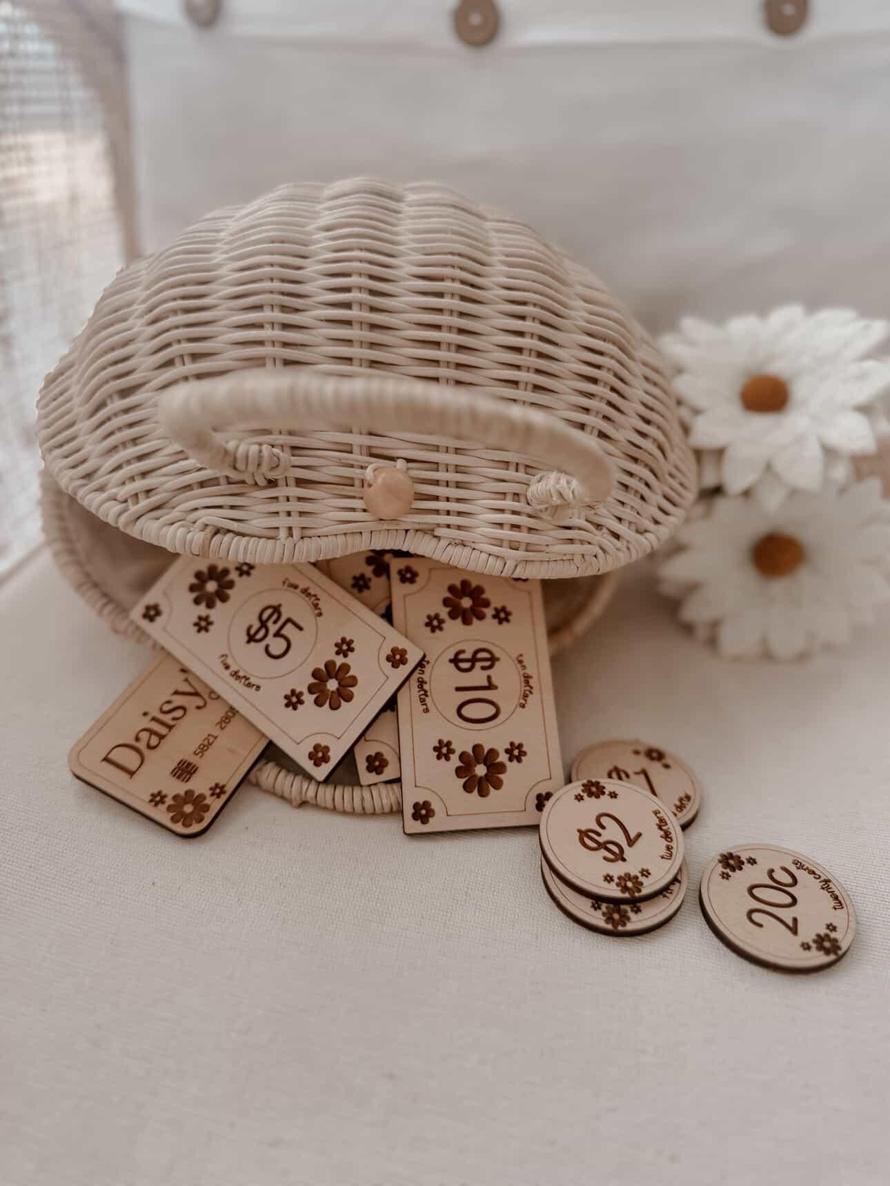 Encourage imaginative play with this children's play money set featuring charming daisy icons. The bundle includes a variety of denominations—$5, $10, $20, $50 bills, and coins—perfect for teaching basic math and money skills. Made from timber, the pieces are durable and tactile. Please note, due to the size of the money, this set is not recommended for children under 3 years old.
