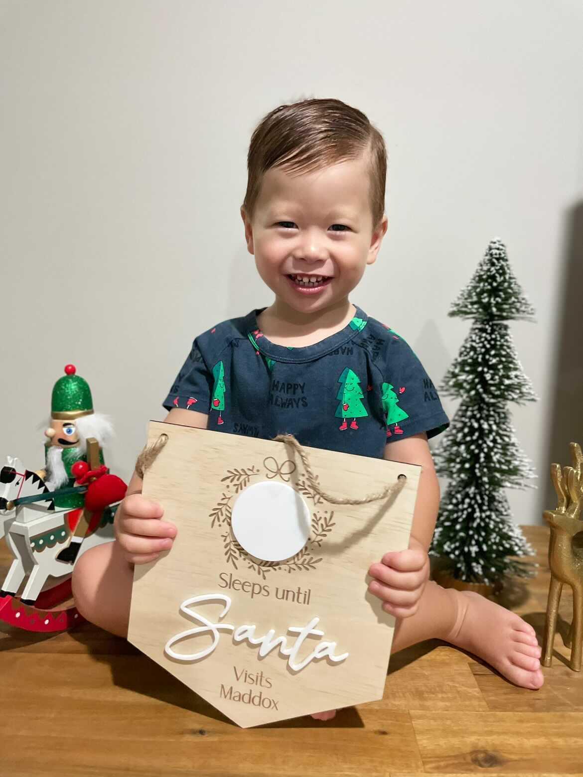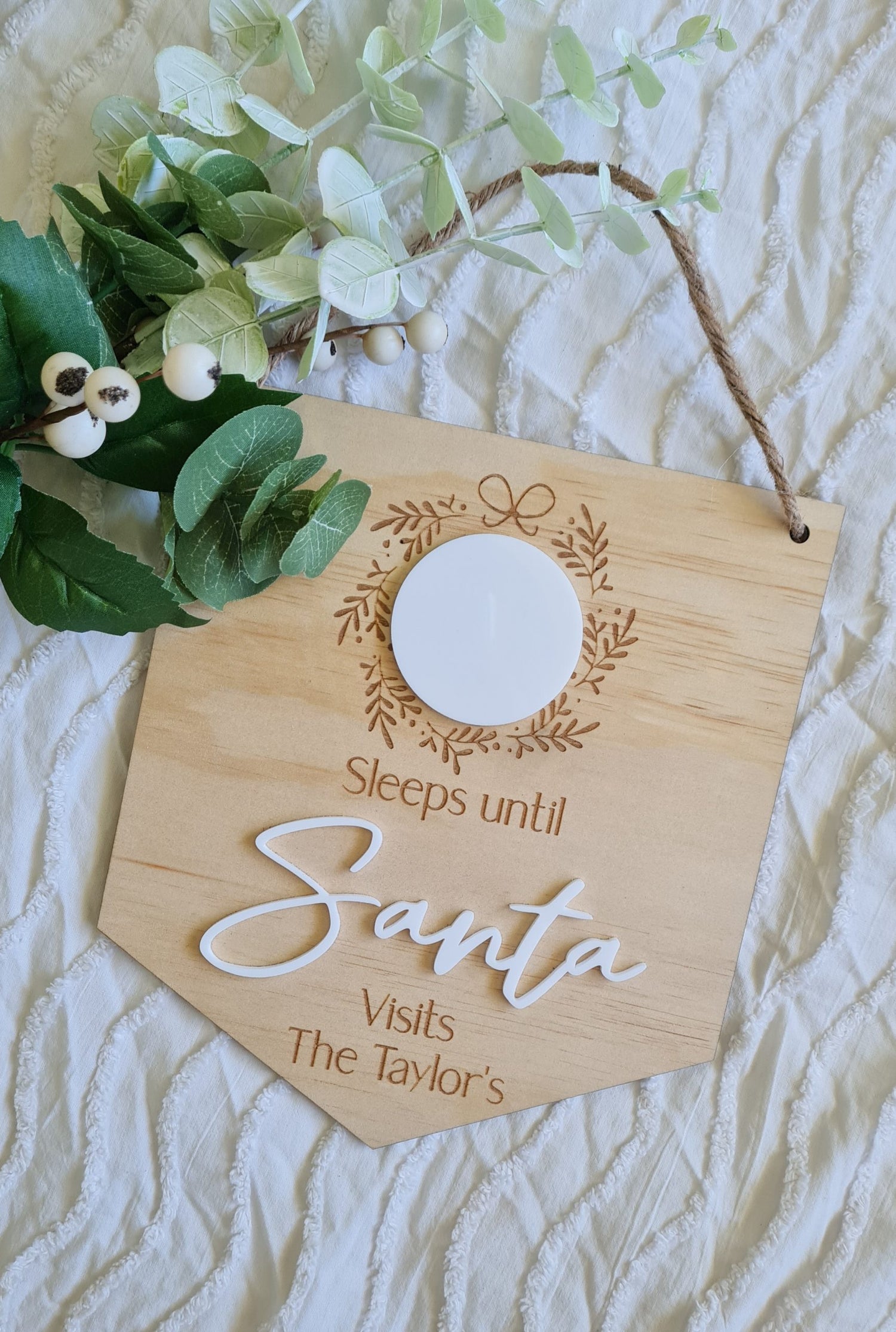 Introducing our cute countdown featuring a wipe on/wipe off acrylic circle. Simply use a whiteboard marker to write the number of sleeps left till Santa visits your little one/s and then remove with a wet wipe.