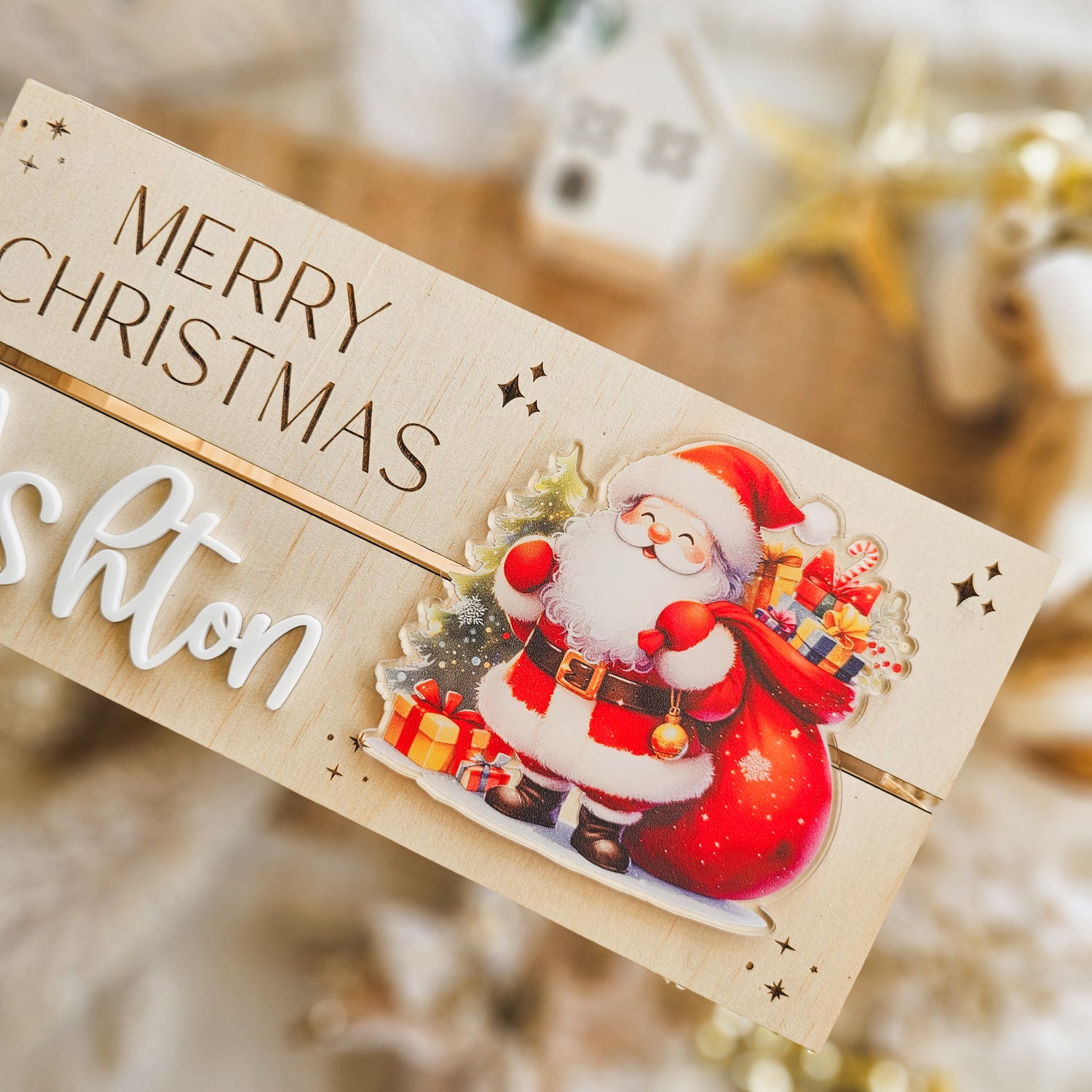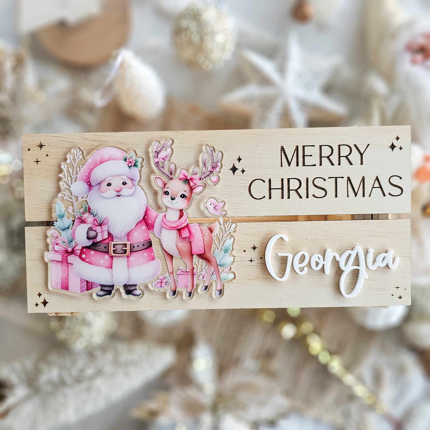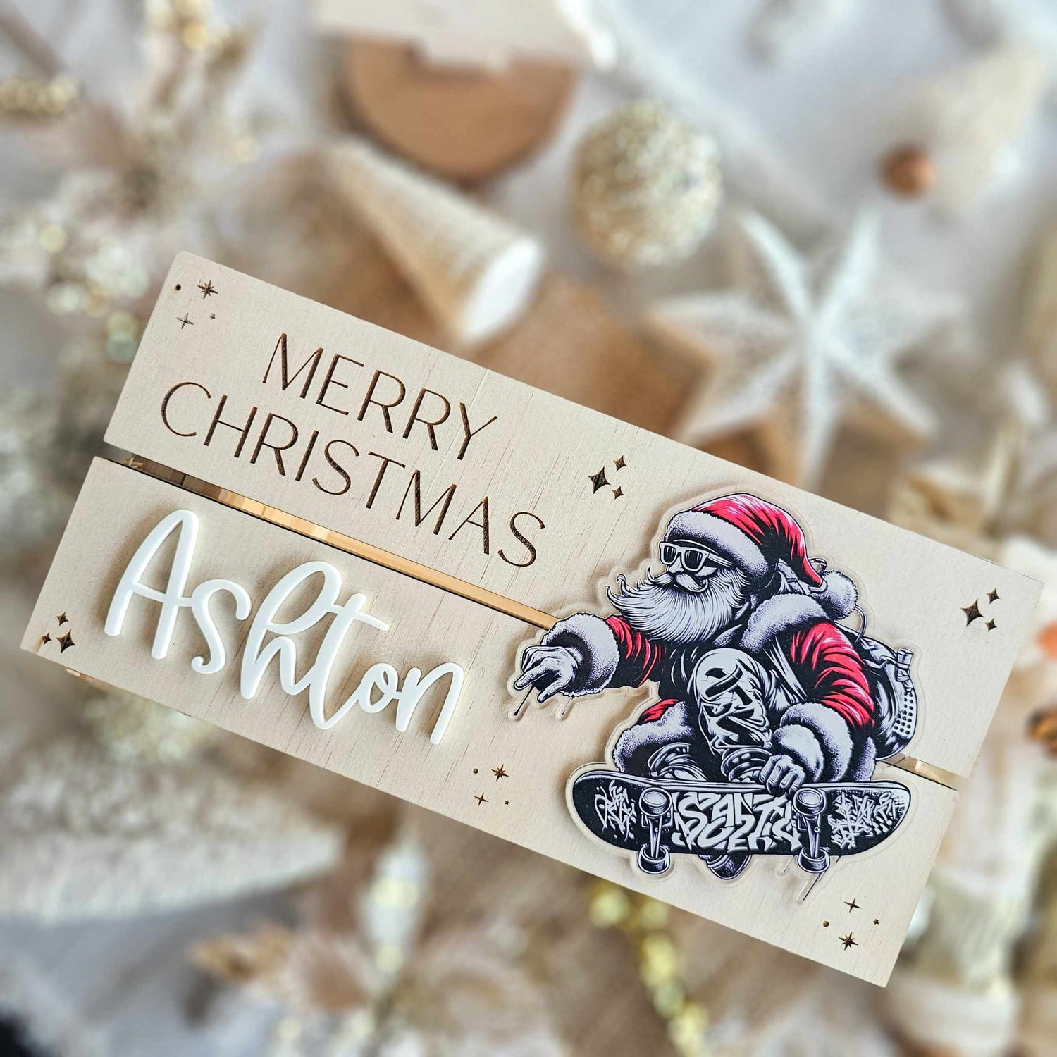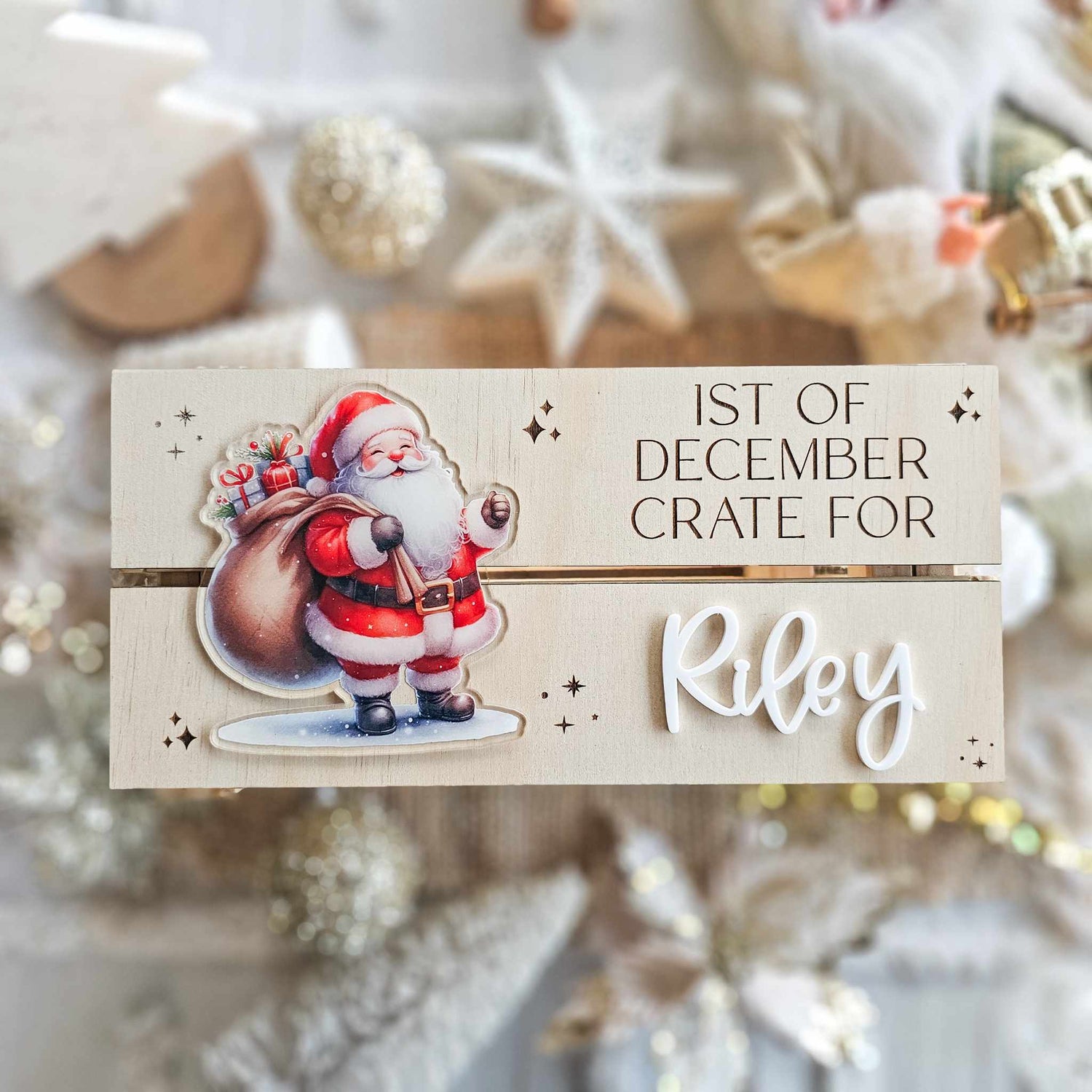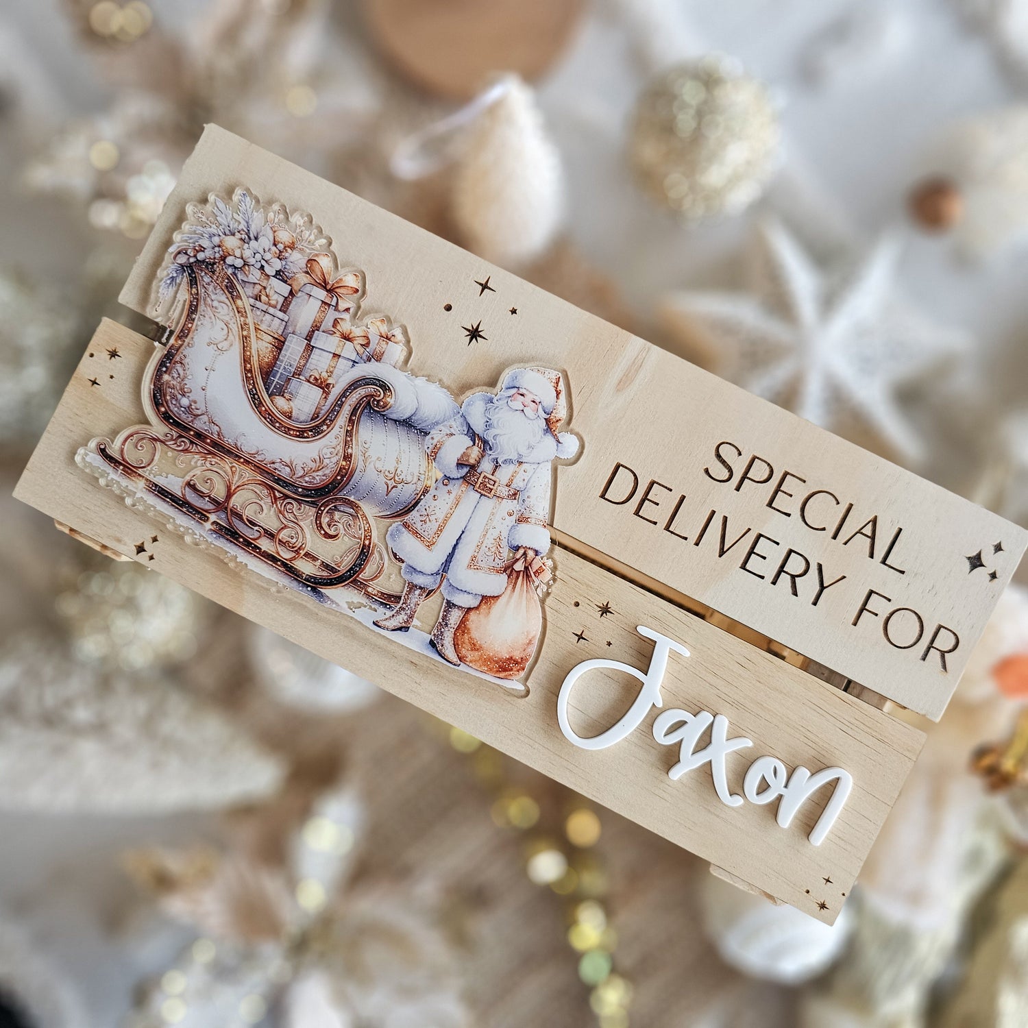 Our Christmas crate feature an engraved christmas message of your choice (Merry Christmas, 1st of December crate, Special Delivery etc), acrylic name and one of 5 of our UV printed Christmas images completed on a timber crate.