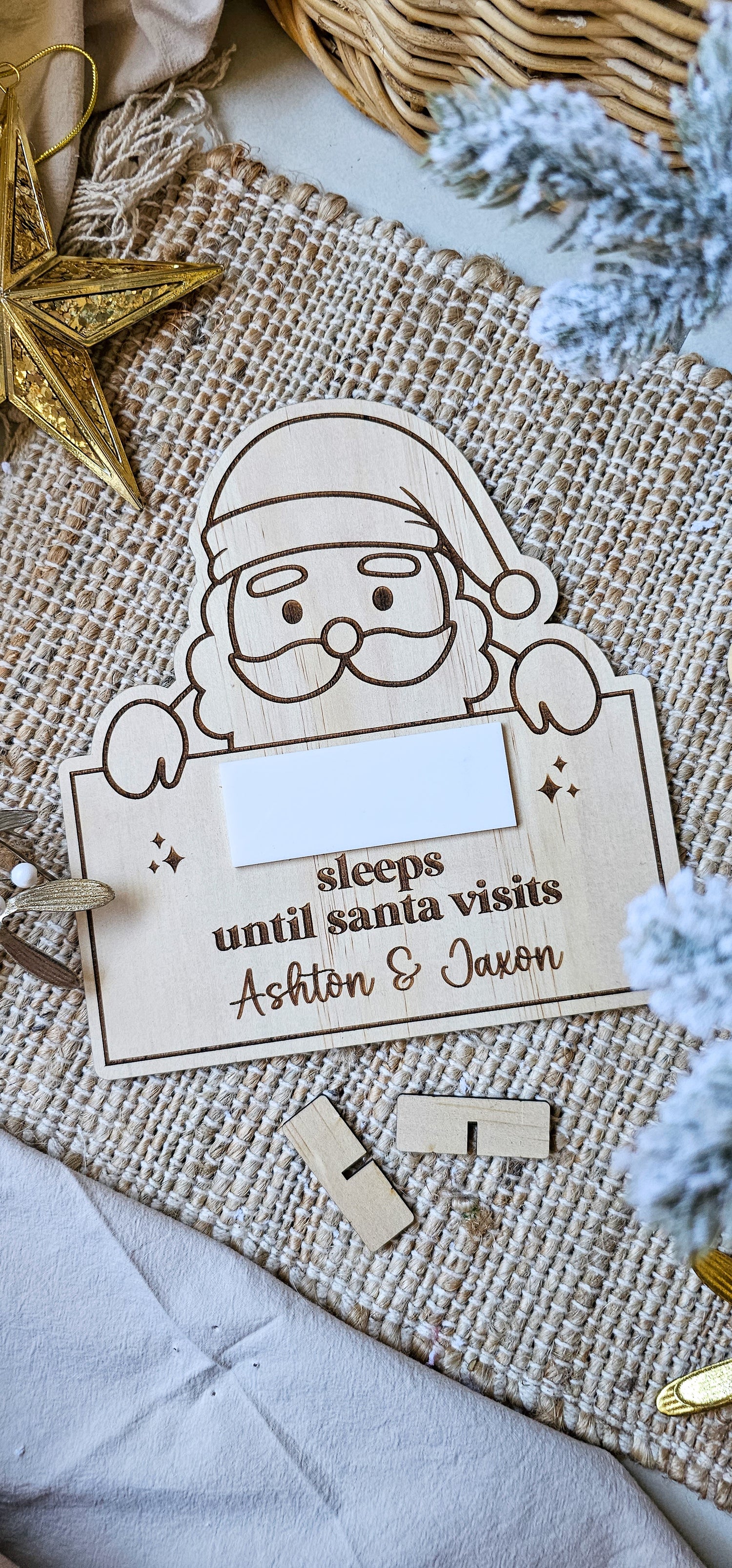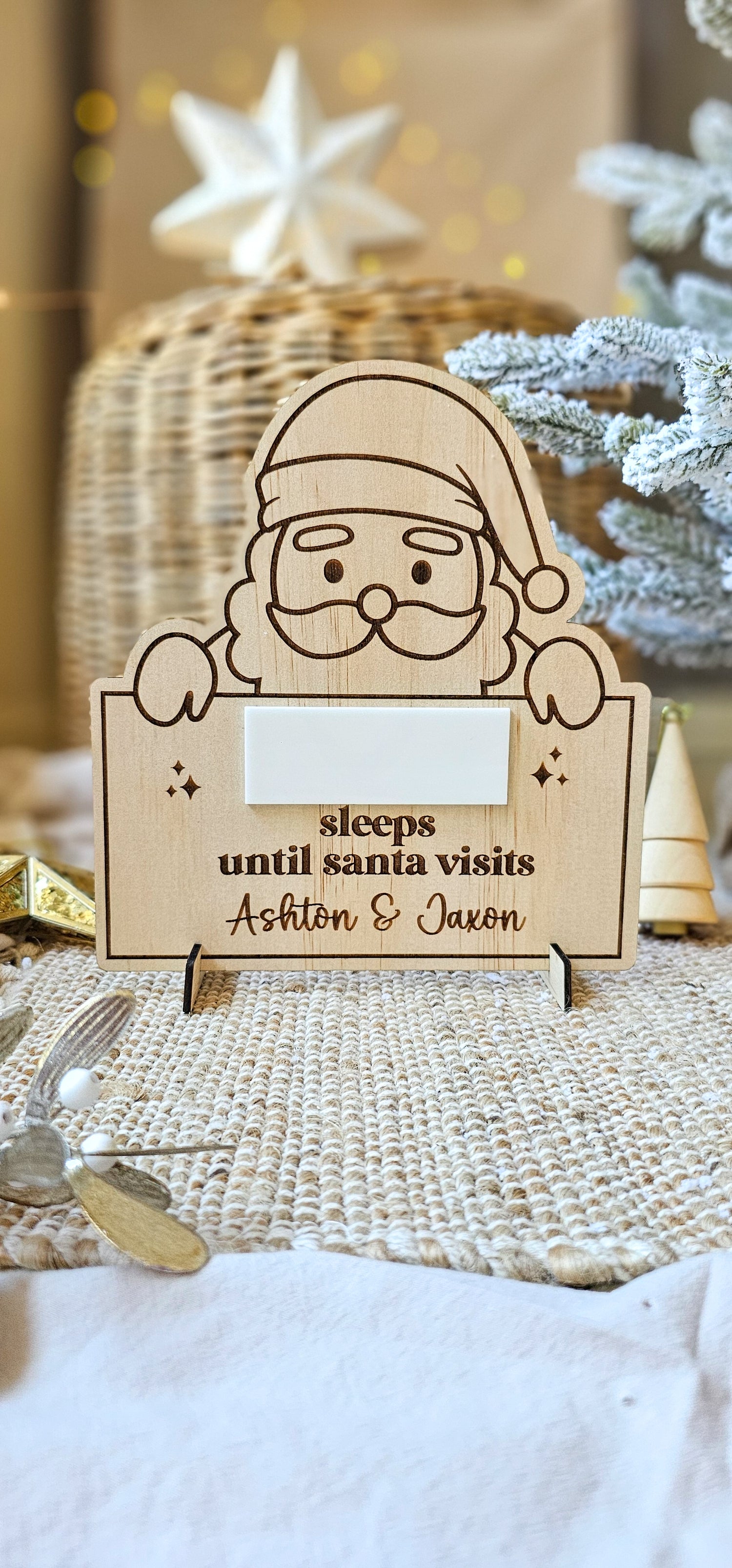 Introducing our cute countdown featuring a wipe on/wipe off acrylic circle. Simply use a whiteboard marker to write the number of sleeps left till Santa visits your little one/s and then remove with a wet wipe.