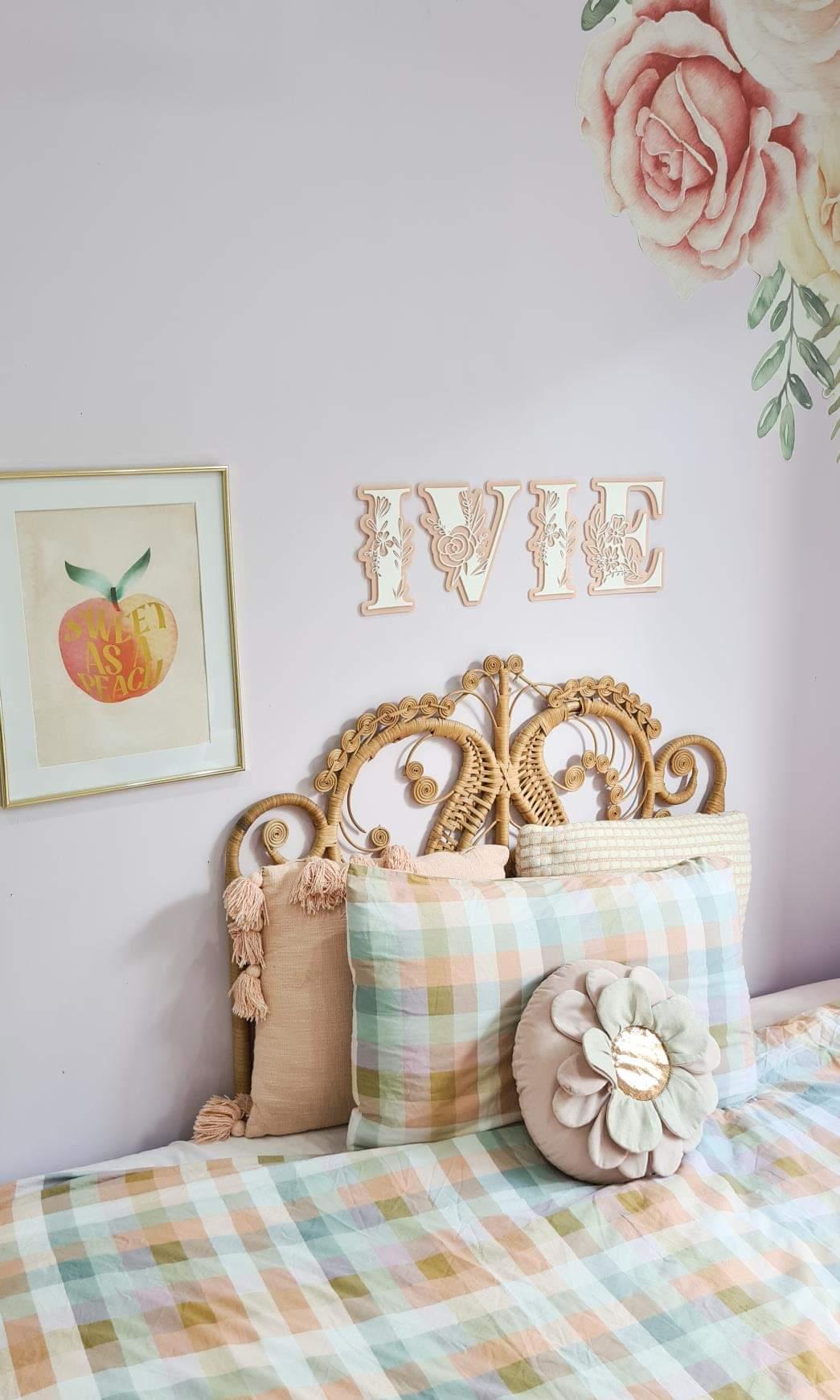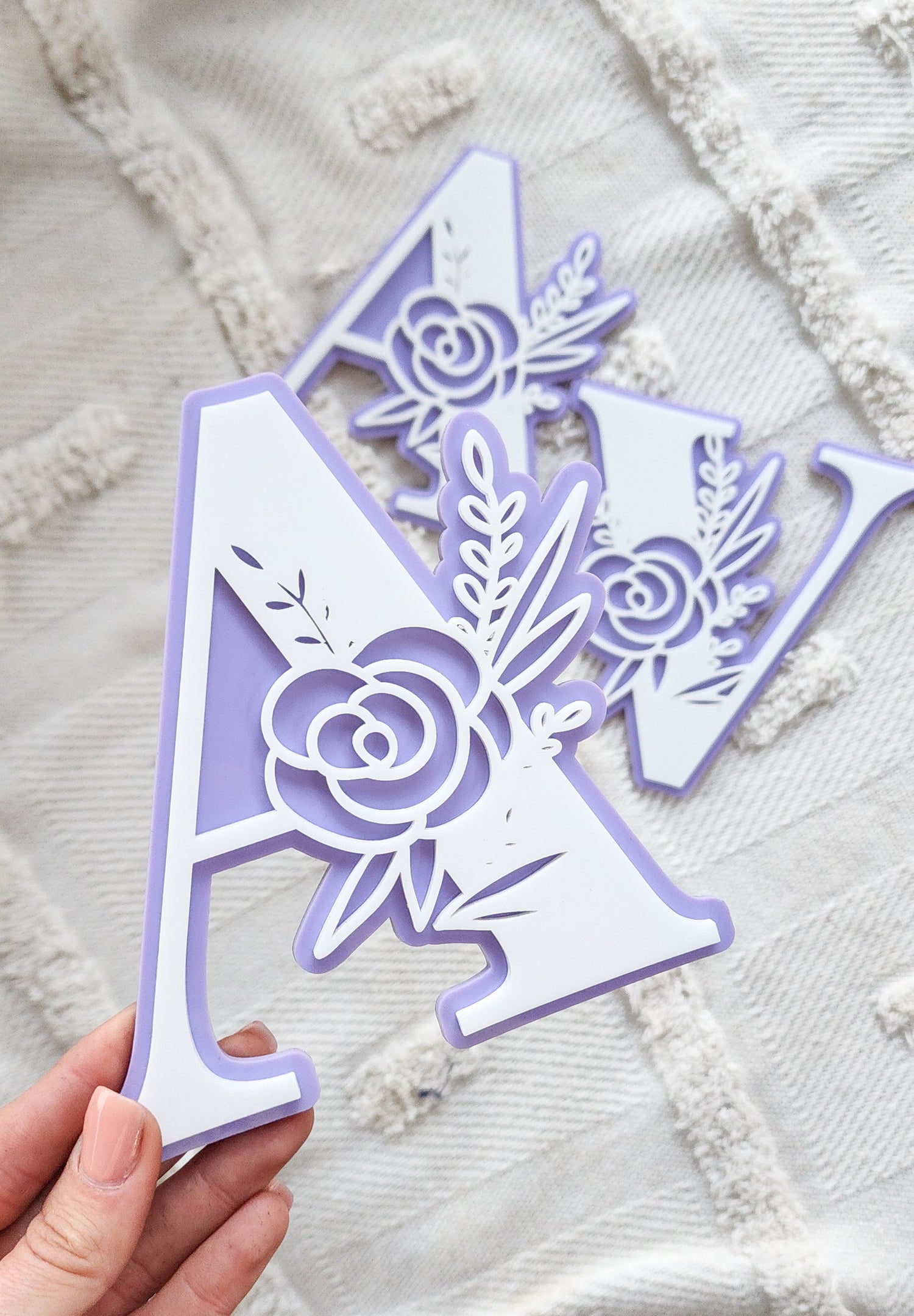 A pretty and personalised statement to add to your little ones room. Featuring a floral acrylic letter and timber base. Available in 2 sizes, medium measuring 15cm in height and large 25cm, please note the length will vary depending on the letter chosen.