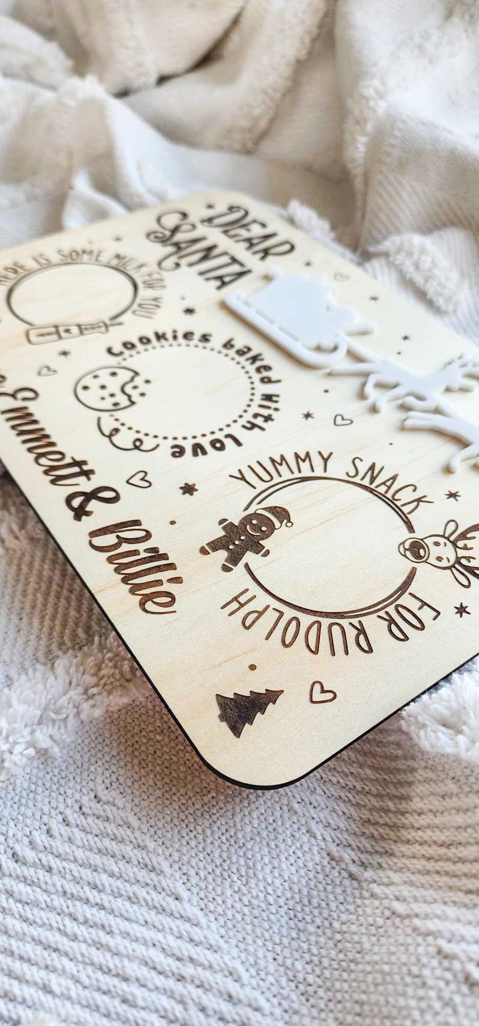 Measuring 30x20cm and created on 3mm plywood. Our treat board has a mixture of engraved detailing and an acrylic sleigh to level up the treat tray. Complete with your kids names to make it extra magical