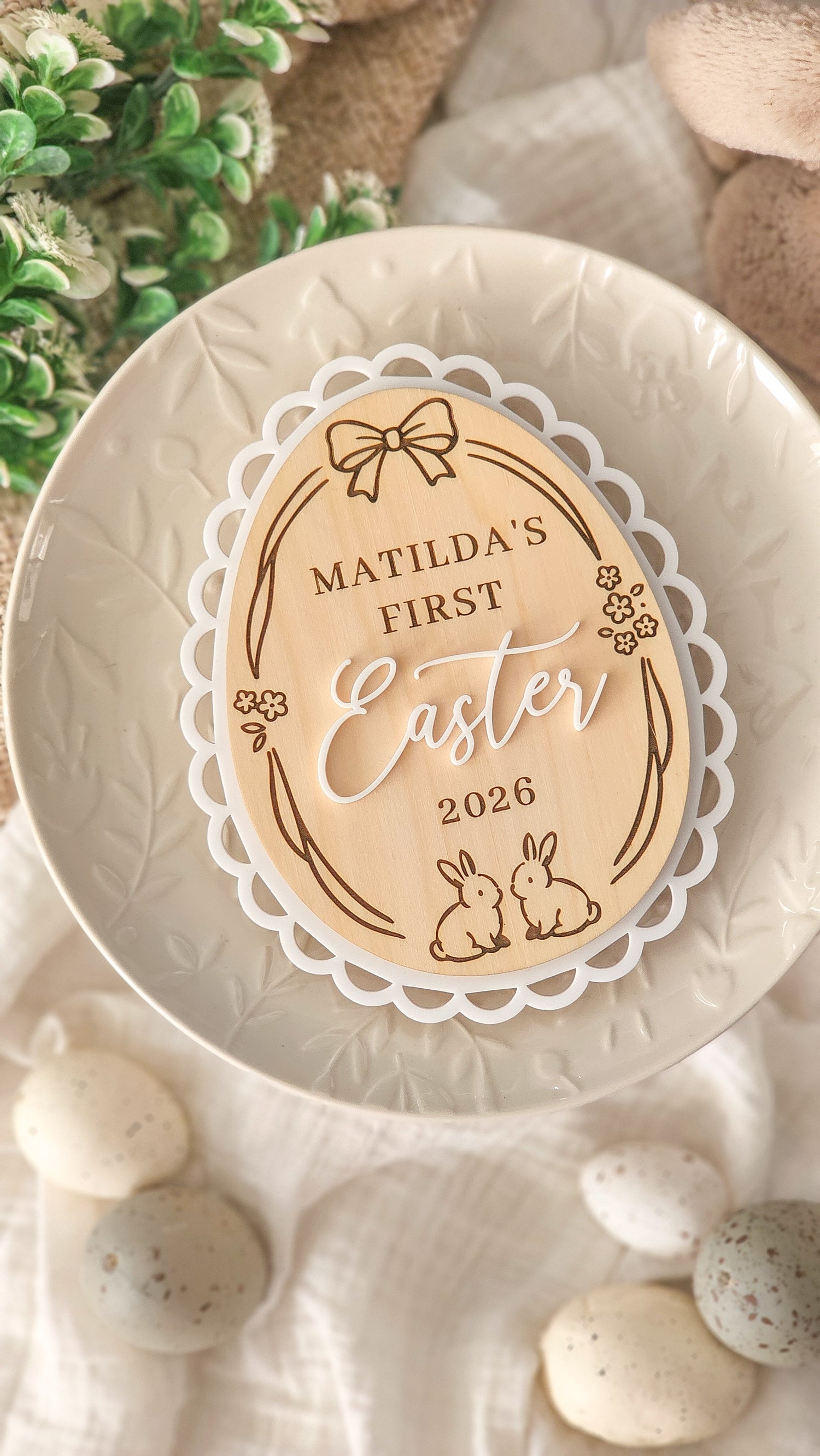 Featuring a layer of acrylic & plywood with a delicate scalloped frame, sweet bunny details and your child’s name with the year, this timeless keepsake is perfect for Easter photos, nursery décor or gifting. Thoughtfully designed to become a treasured memory piece you’ll bring out year after year.