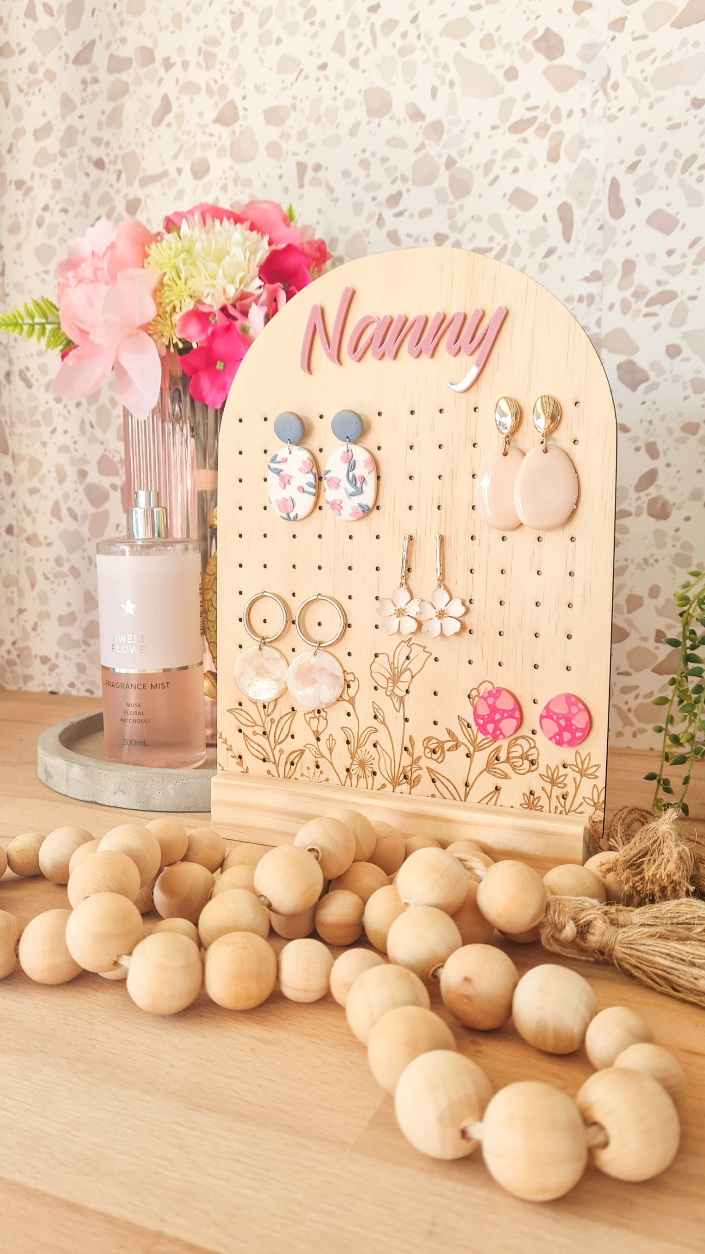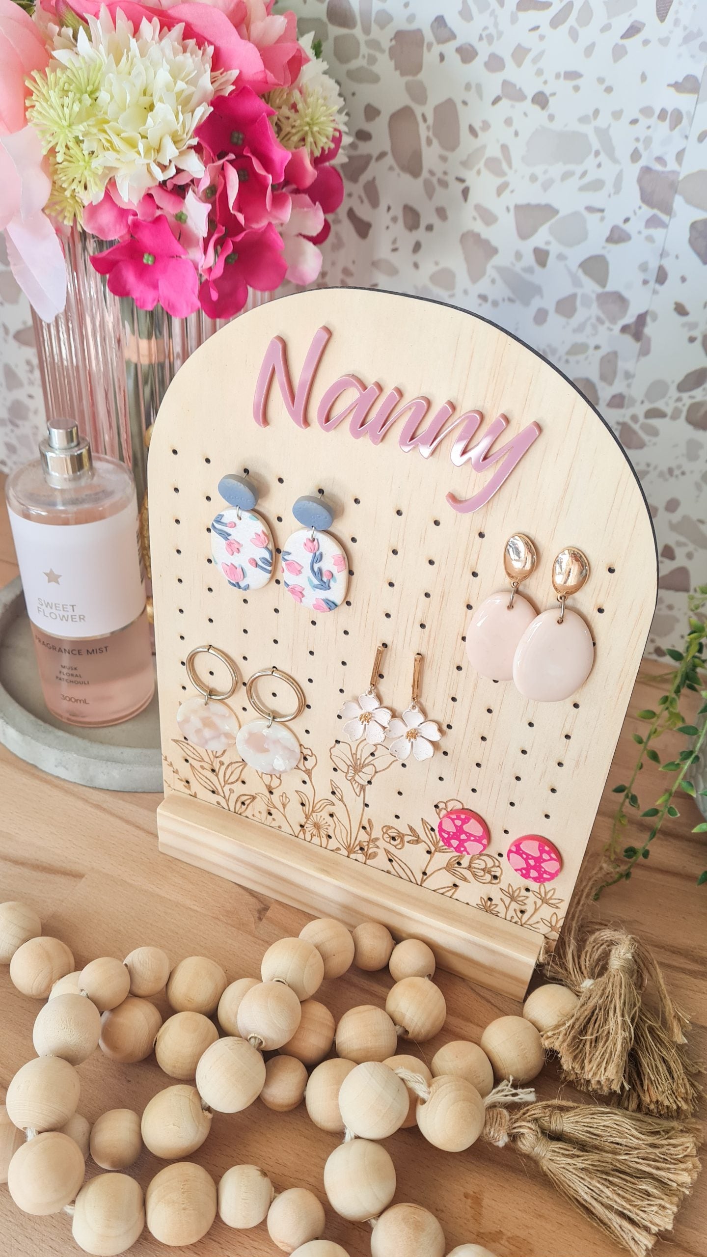 Featuring 30cm x 20cm timber earring holder features a gorgeous engraved floral detail on the base and a 3D acrylic title on the top, completed with a 7mm timber stand (slightly different to image). You may opt to engrave a special message on the stand also for an additional fee.