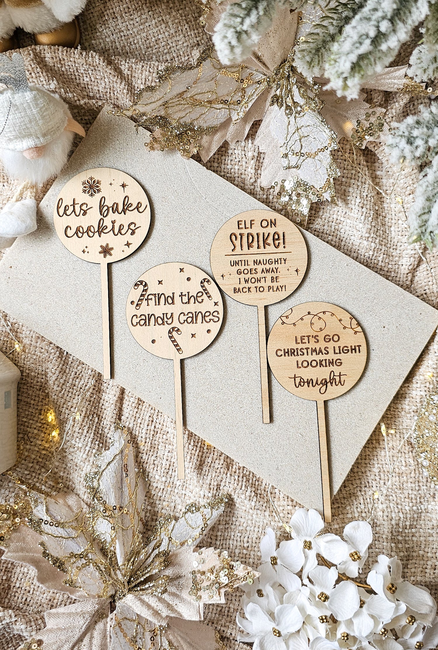 Add some playful fun to your holiday decor with these Elf Sign Props. Use them to showcase your elf or come up with your own creative ways to display them. Bring some holiday cheer to your home and brighten up the season with these quirky props.