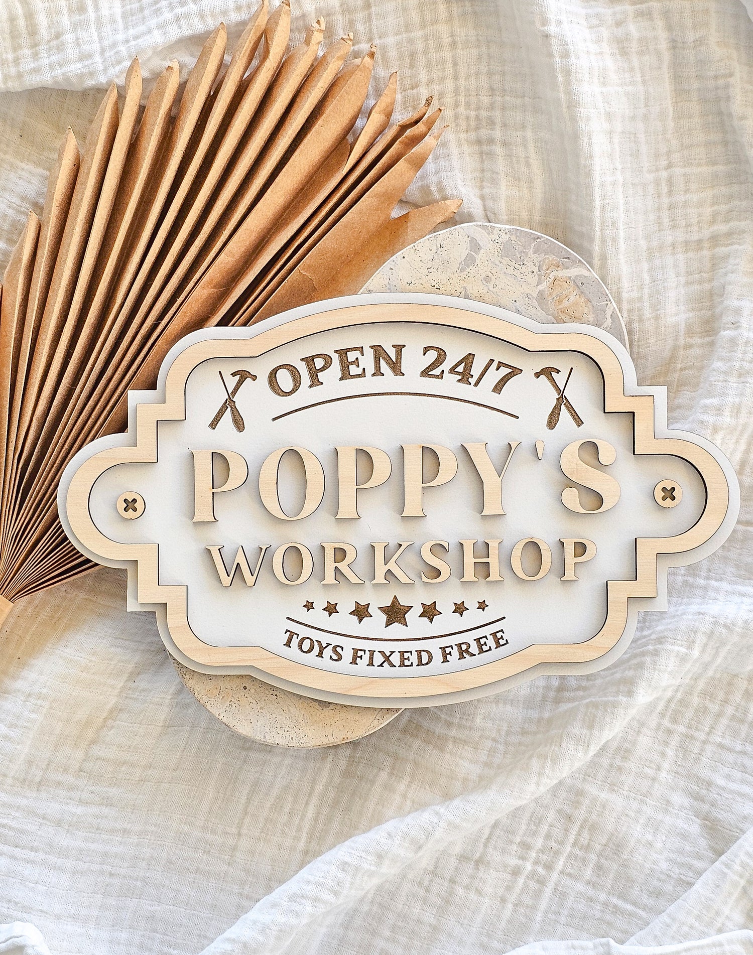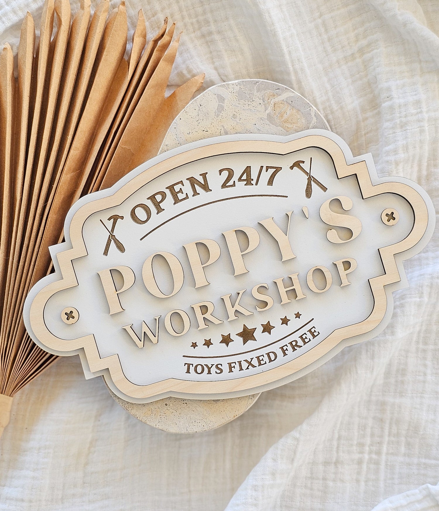 Celebrate Father's Day with a playful touch at Poppy’s/ Dad's/ Grandpa's Workshop! This Father’s Day sign humorously invites everyone to bring their toys for a free fix, making it the perfect way to add fun and charm to your event. Brighten the day with a sign that promises smiles and a little hands-on magic.