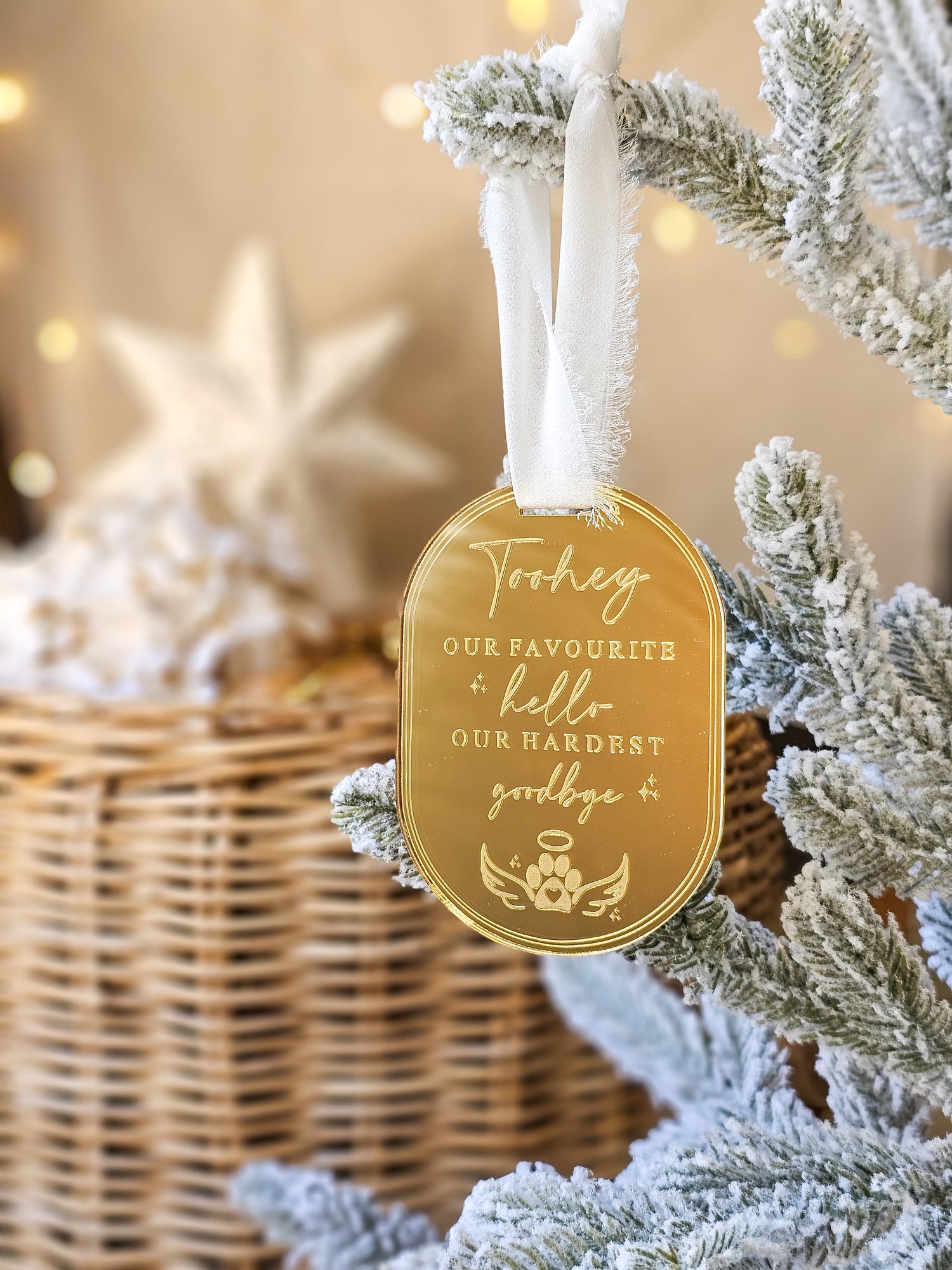 Honour lost fur babies with our Favourite Hello - Hardest Goodbye ornament. This Christmas bauble is a lasting reminder of a special fur child in your life. With a delicate inscription of both your favourite hello and saddest goodbye, this ornament will be treasured for years to come.