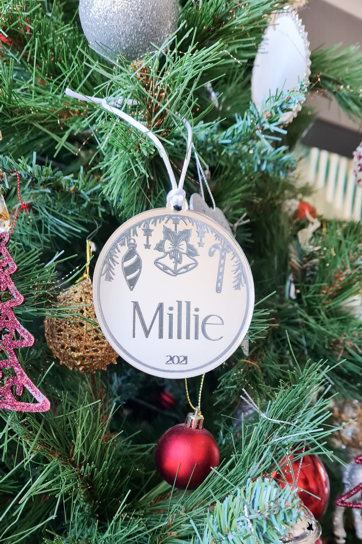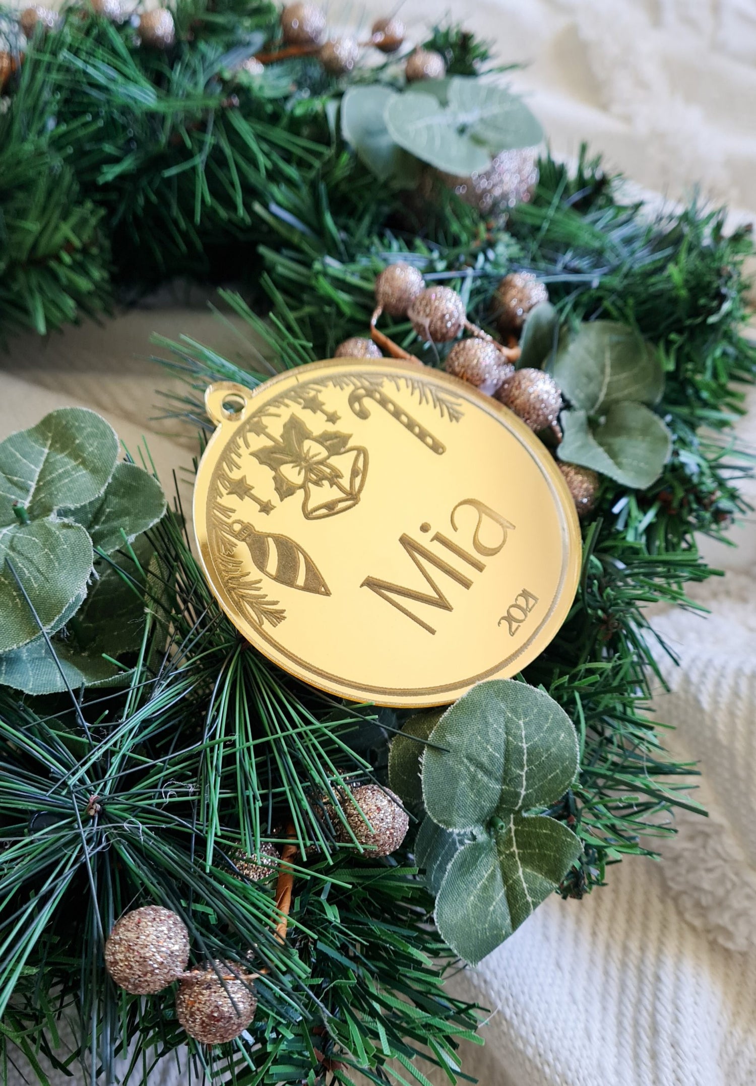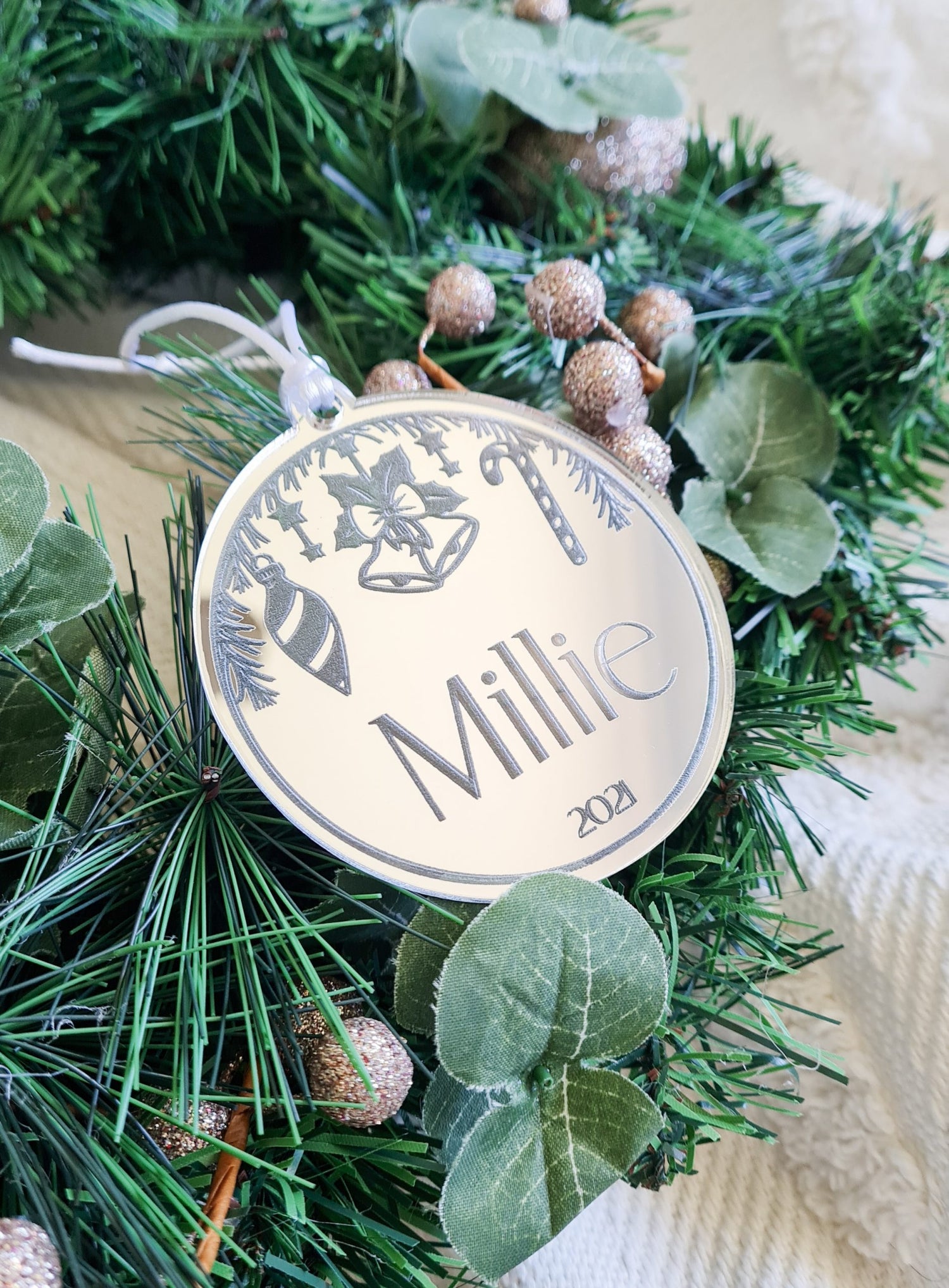This 8cm diameter engraved bauble is made from 3mm mirror acrylic and comes in a range of colours.