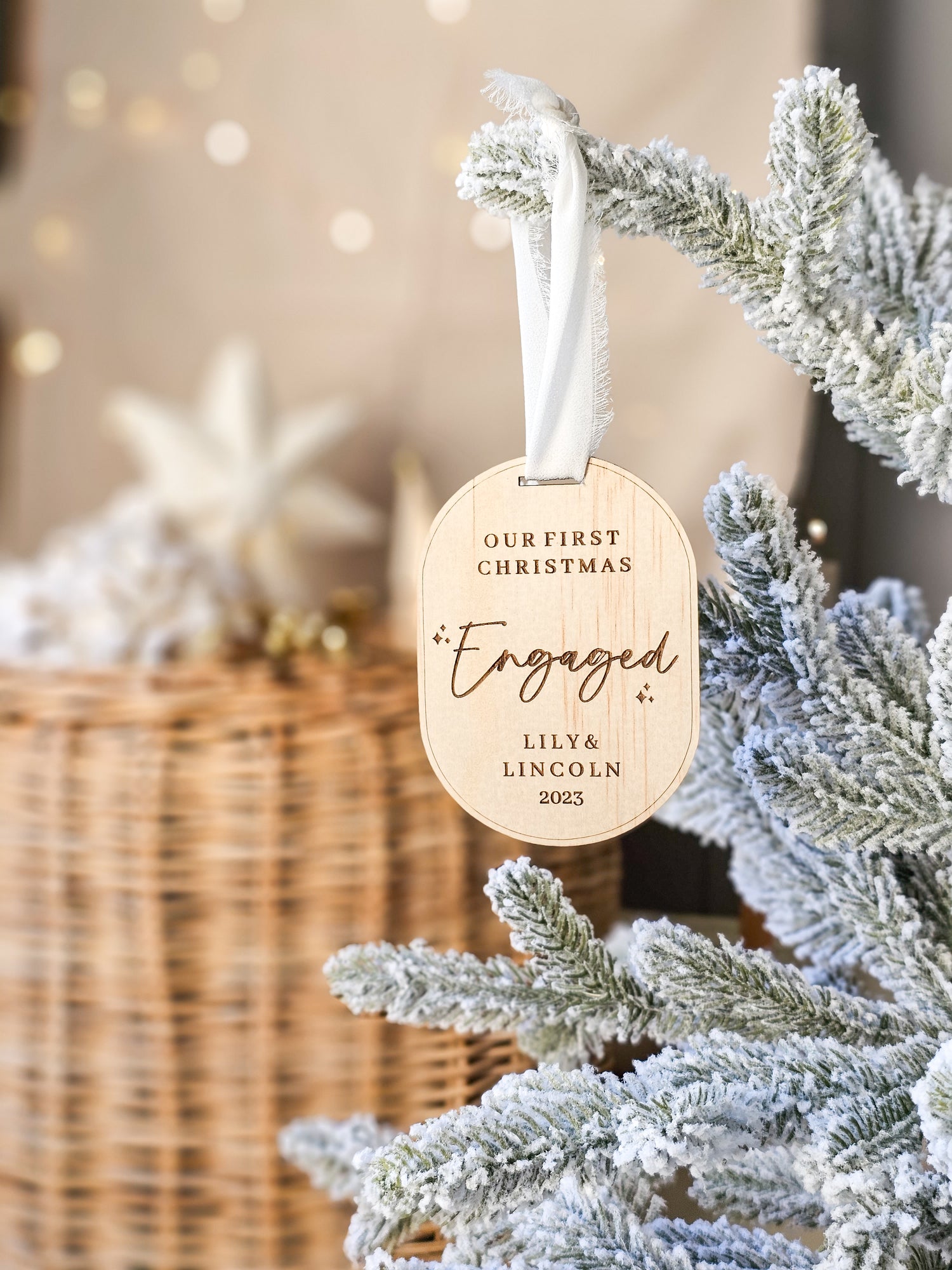 This stylish oval-shaped ornament is the perfect way to commemorate your first Christmas together as an engaged couple. Hang it on the tree as a reminder of your special day and make it a beautiful part of your seasonal traditions.