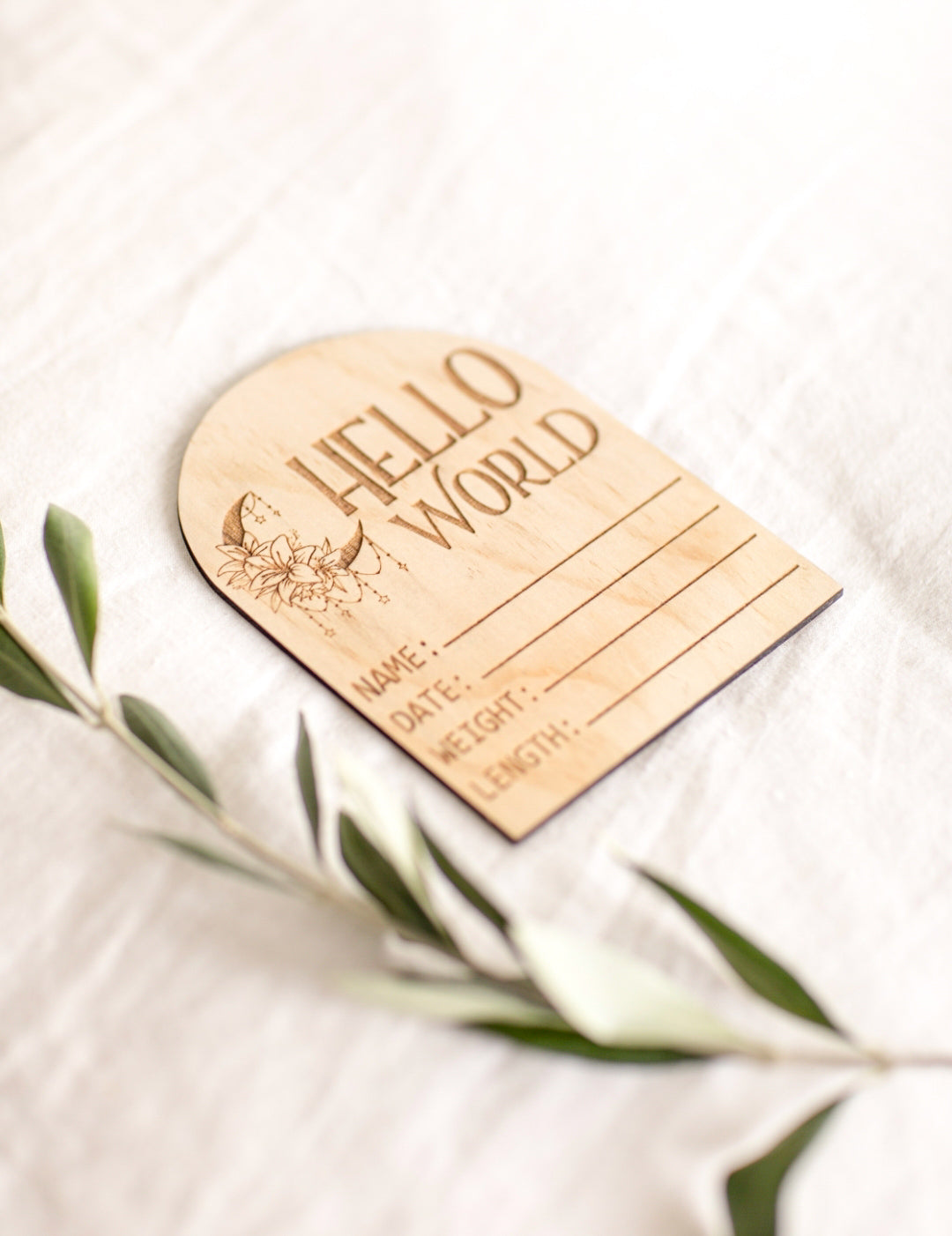 Annouce your baby's arrival with our half moon timber engraved plaque - measuring 15cm