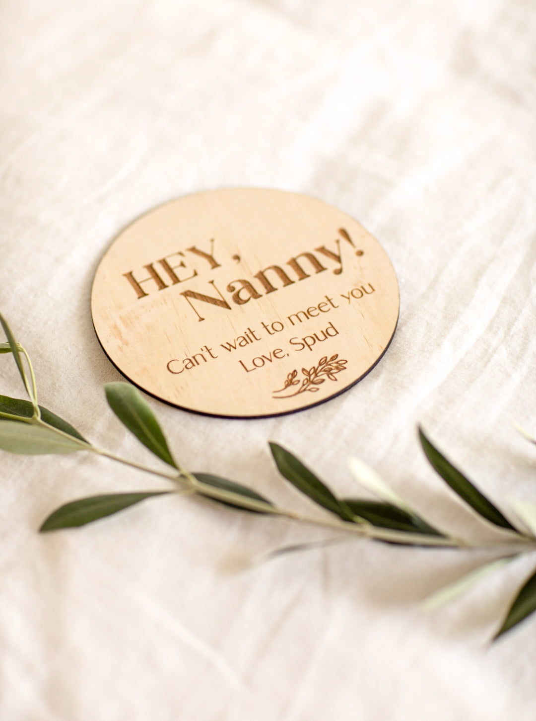 Annoucement your exciting news to your loved one with this super special engraved timber plaque. Measuring 15cm and can be personalised to any family member