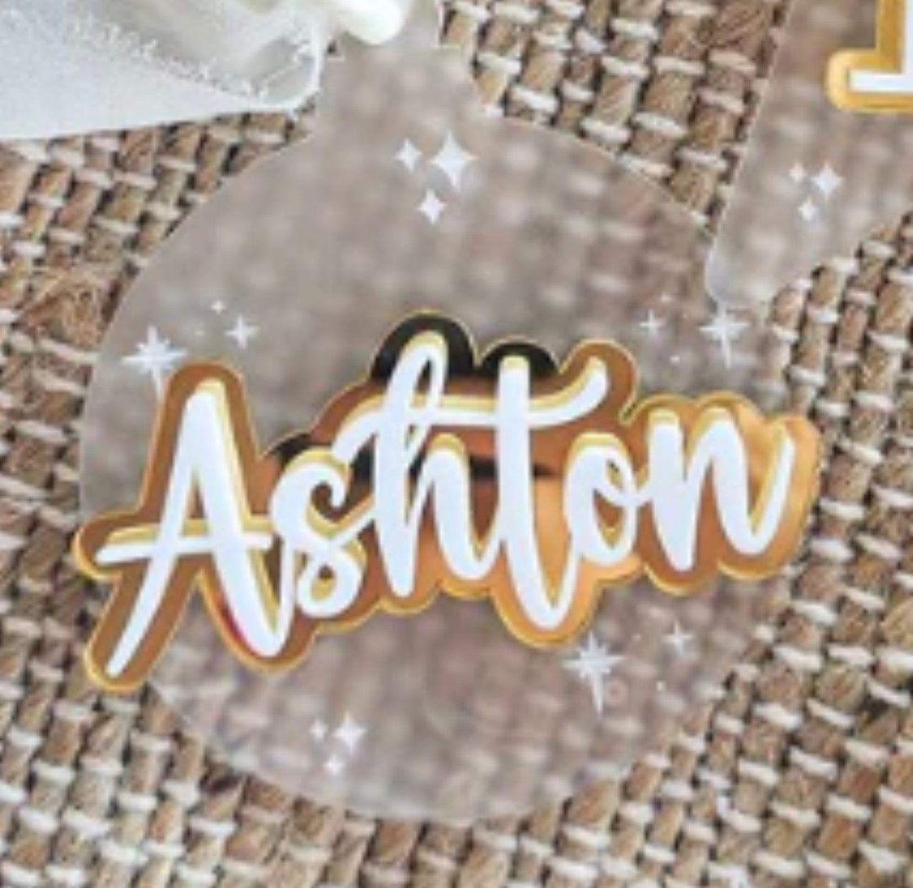 My daughter’s name (Luka) in the same style as the Layered Acrylic Ornament below (letter top colour in white solids and base mirror colour in gold):
