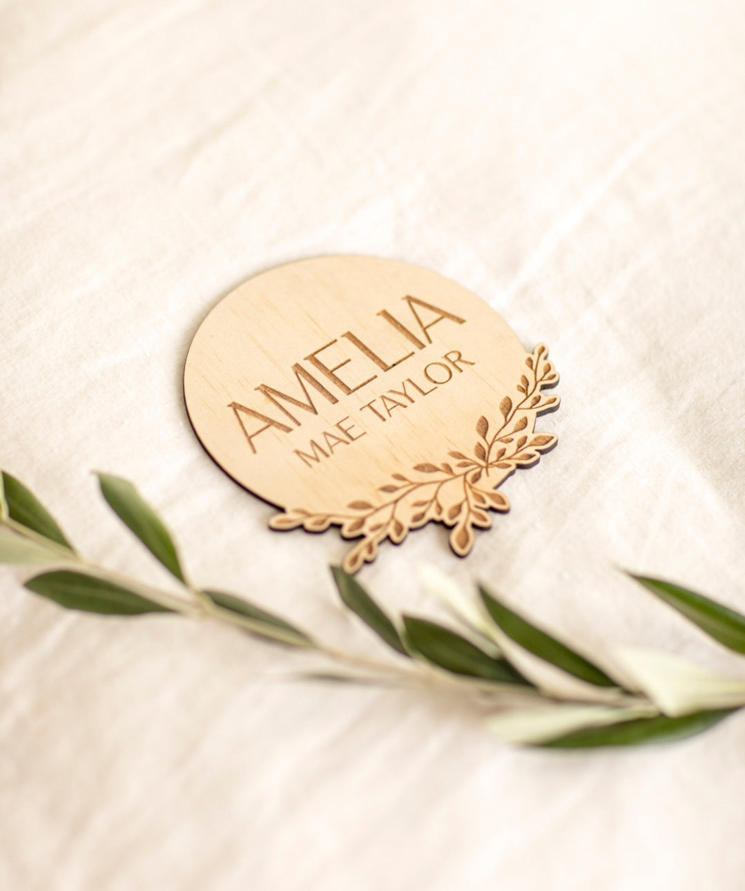 A stunning way to annouce your baby's arrival and name. Featuring a leaf pattern and on 15cm engraved timber.