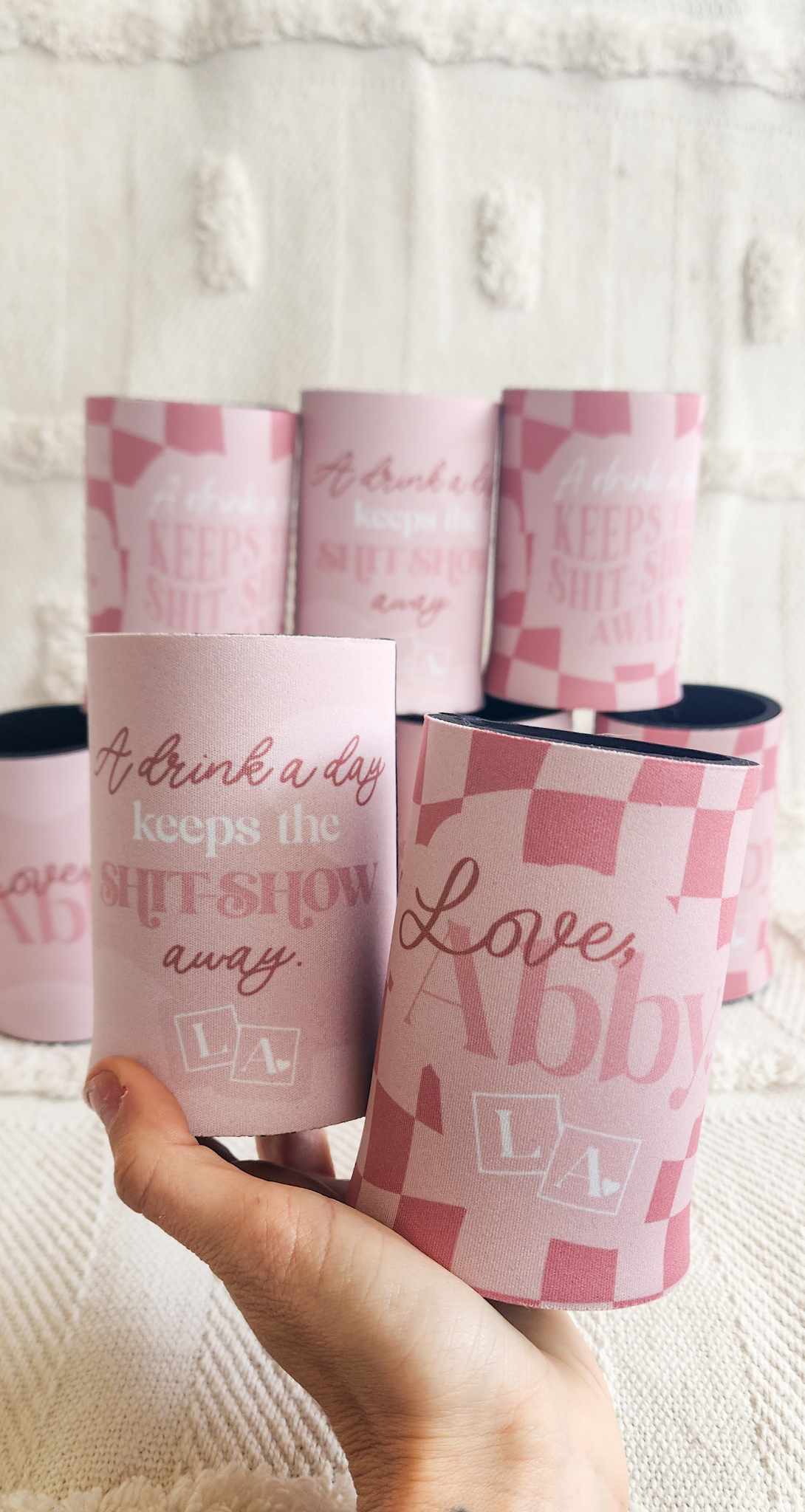 I can't explain how in love I am with our incredible stubbies. They are available in 2 unique designs and both double sided. Featuring a quote, I say regularly ' A drink a day keeps the shit show away.'