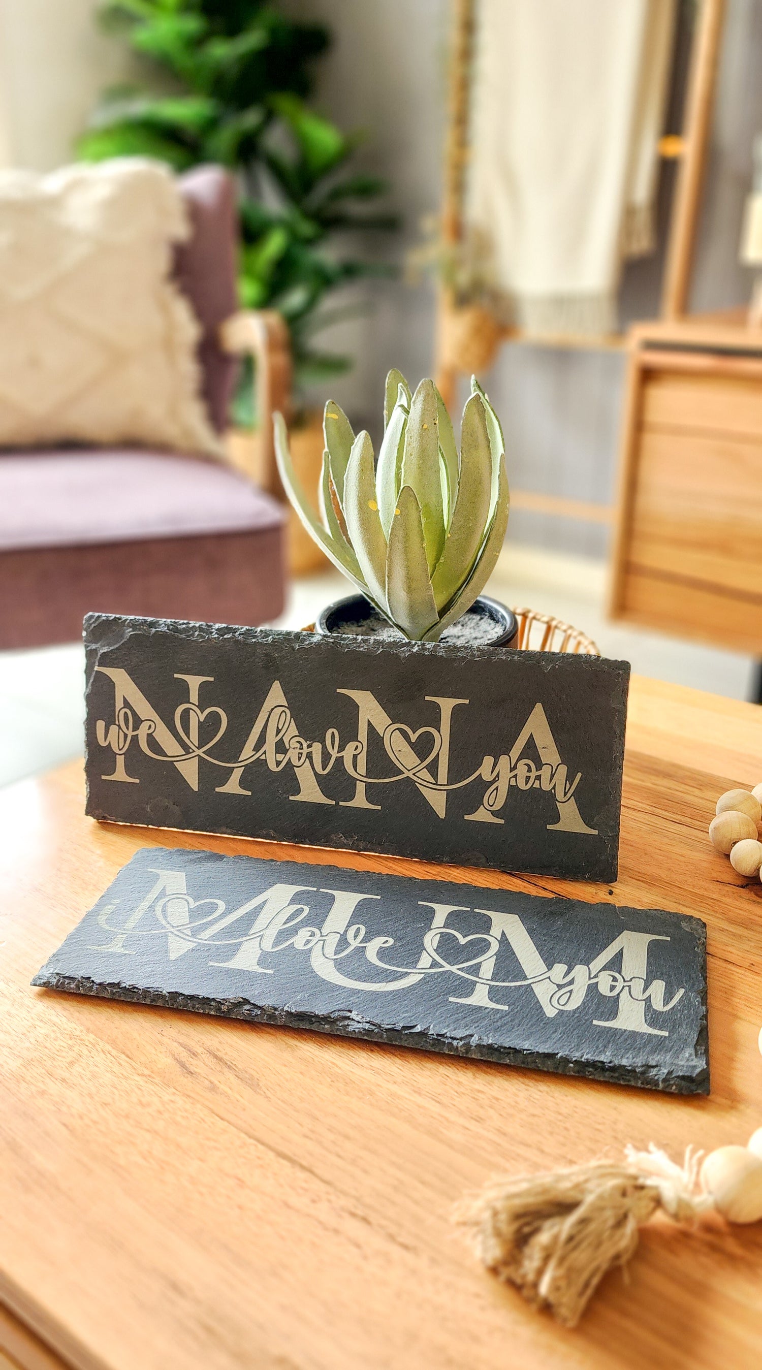 Featuring a 30x11 natural slate tile with an engraved name of your choice with either 'I love you' or 'we love you' throughout the middle.