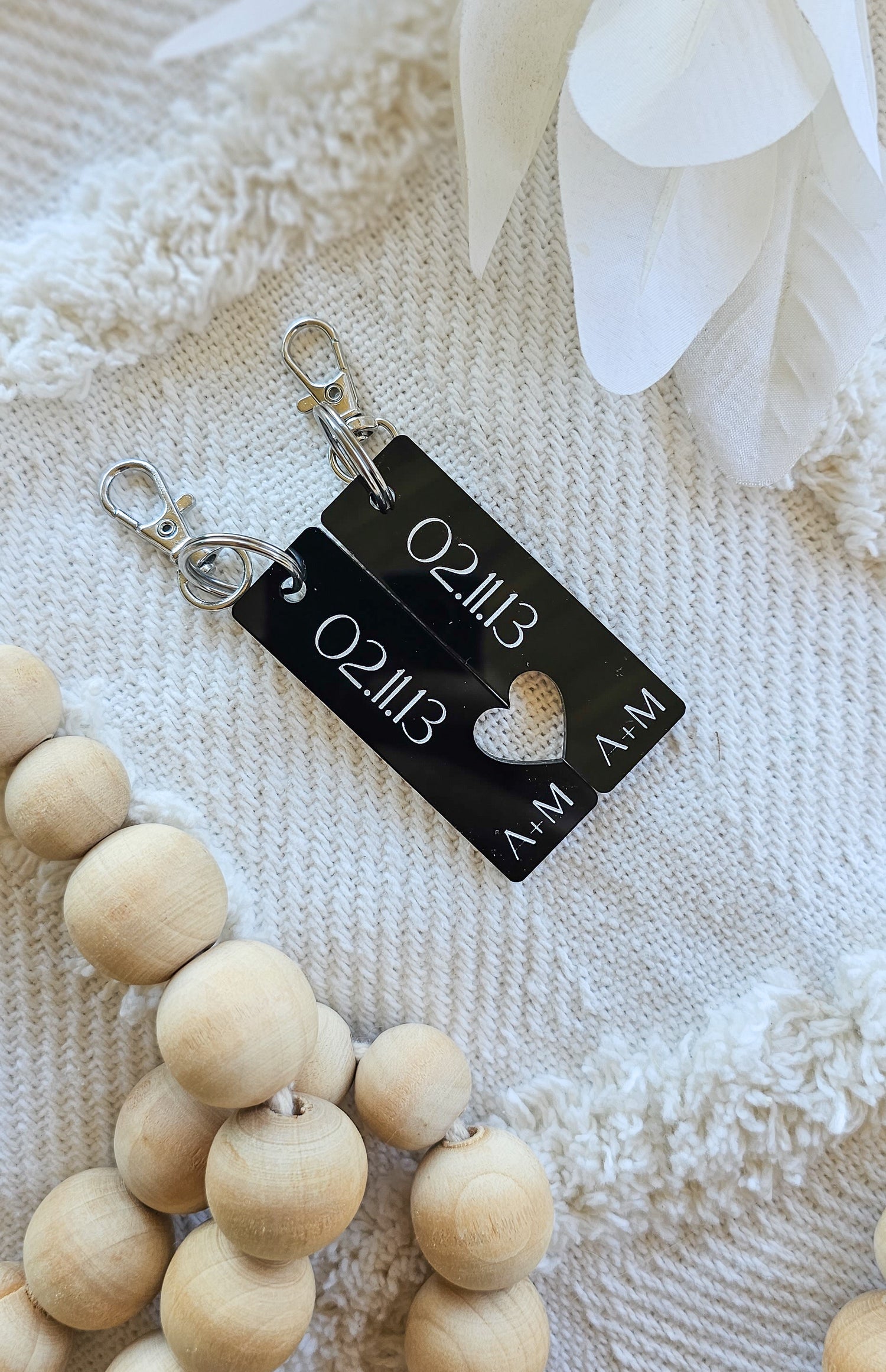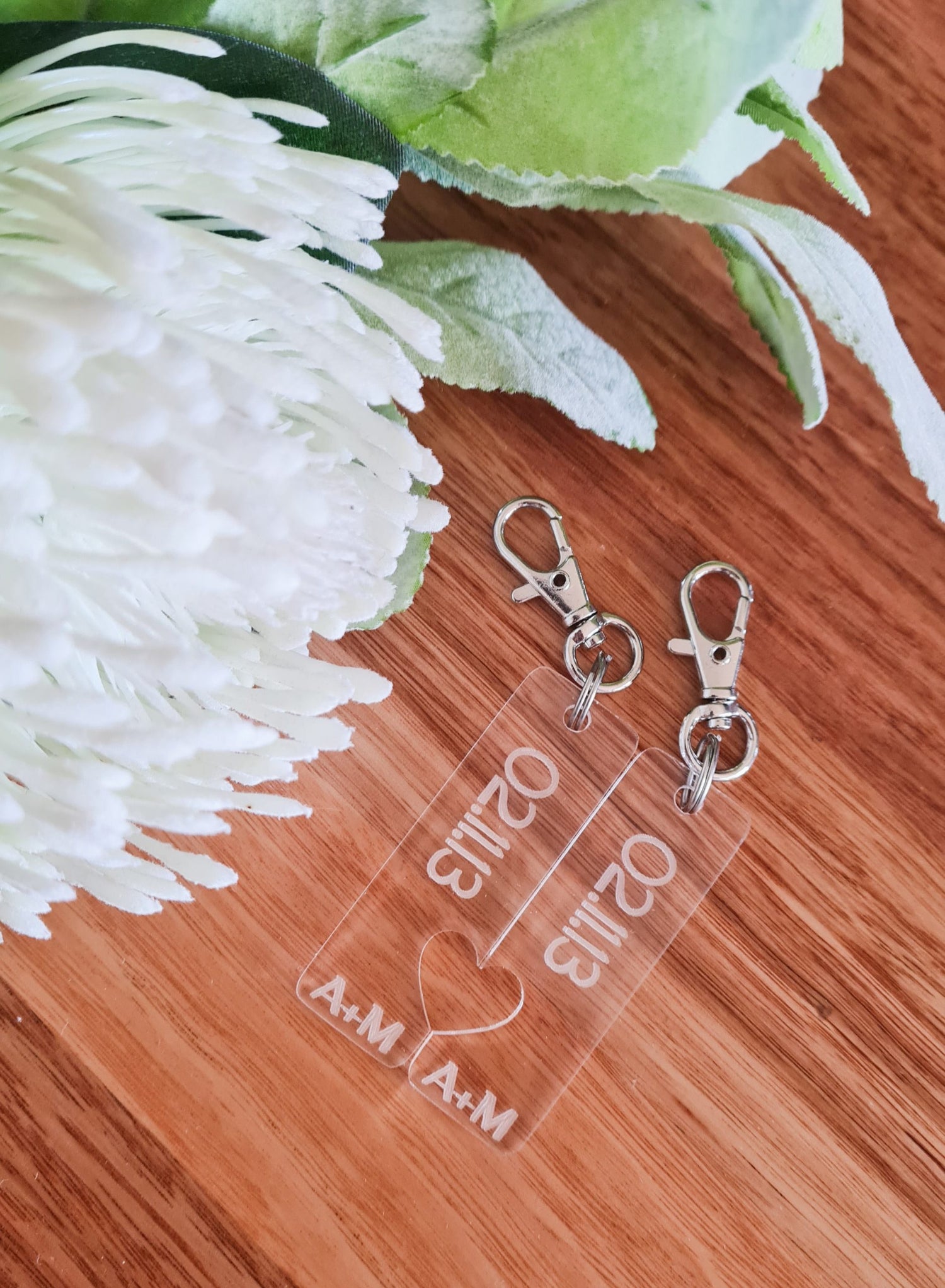 This pack includes 2 lover keyrings in either timer or clear acrylic with a date and your initials, measuring 2cm x 6 each