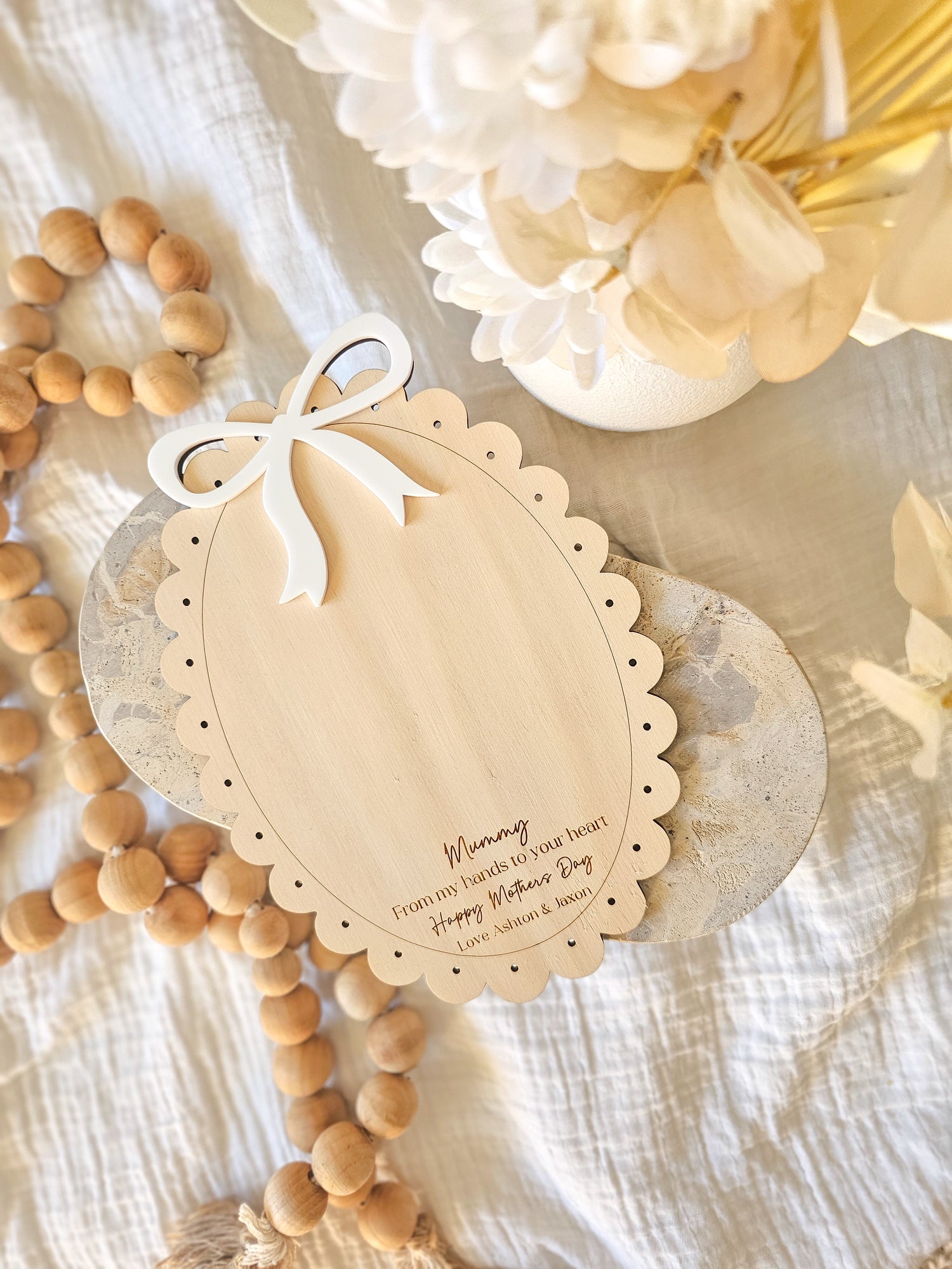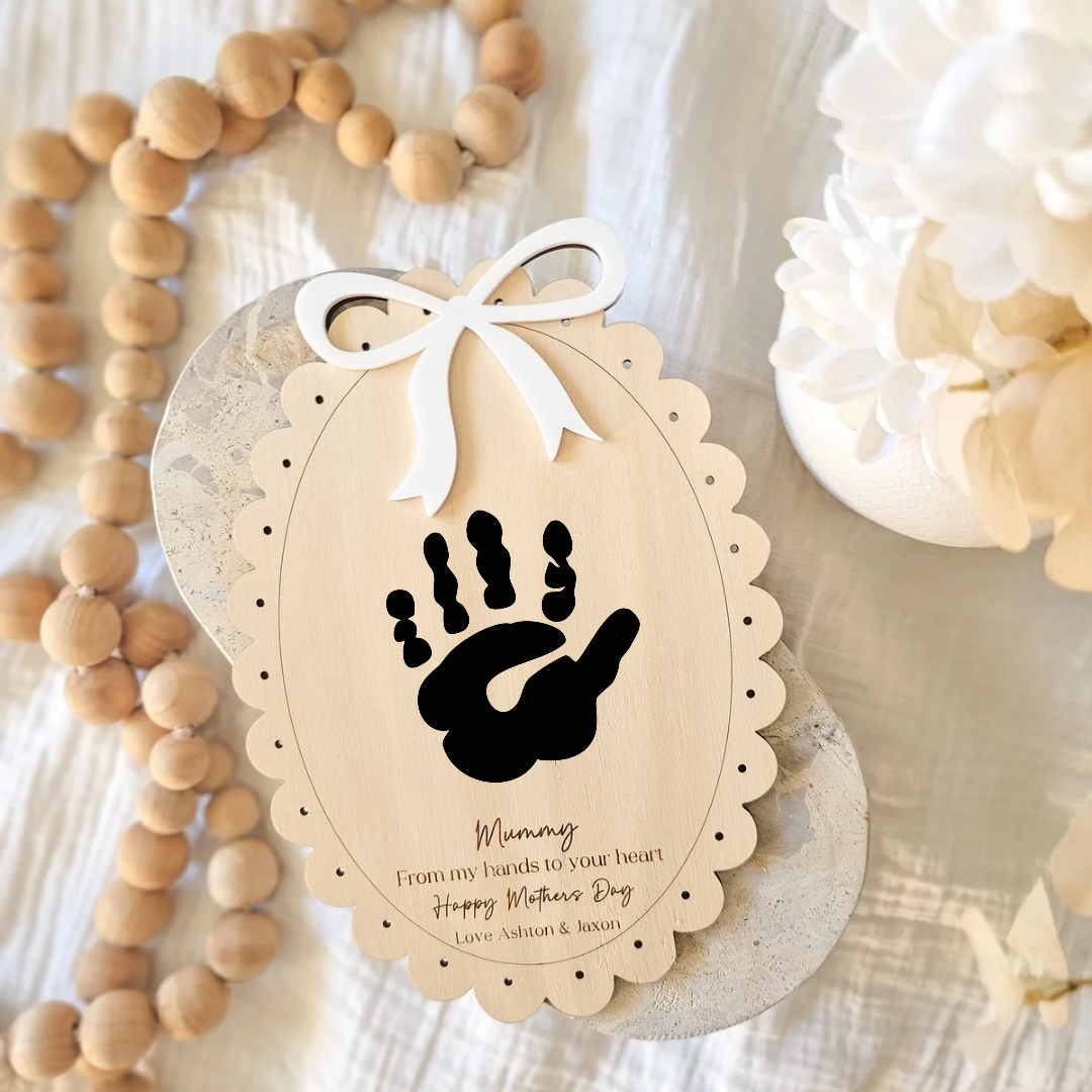 Timeless charm meets tiny hands with this beautifully classic keepsake plaque. Designed in an elegant vintage oval shape and finished with a sweet little bow, it’s the perfect backdrop for your child’s handprints. A heartfelt gift for Mother’s Day, this plaque turns messy moments into lasting memories. Whether painted with love or decorated with flair, it’s a piece Mum/Nana will proudly display for years to come.