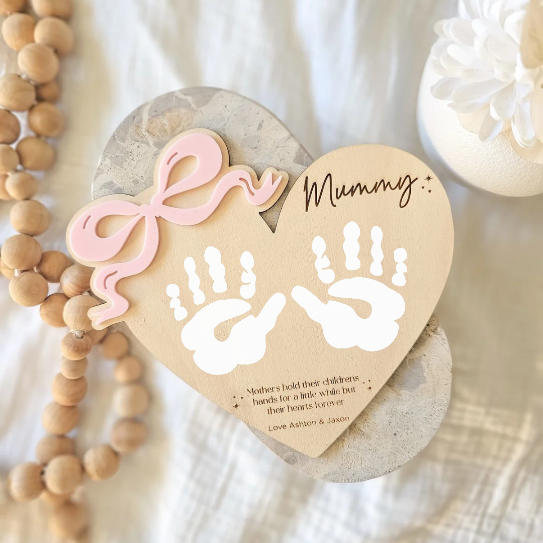Celebrate Mom with a gift that’s straight from the heart—literally! This charming heart-shaped plaque is the perfect canvas for little handprints, creating a sweet and sentimental keepsake she'll treasure forever. Topped with an adorable bow, it adds just the right touch of whimsy to any space. Whether it's messy paint or tiny fingerprints, this DIY-ready plaque is all about capturing memories in the most heartfelt way. Perfect for little hands, big love, and smiles all around.