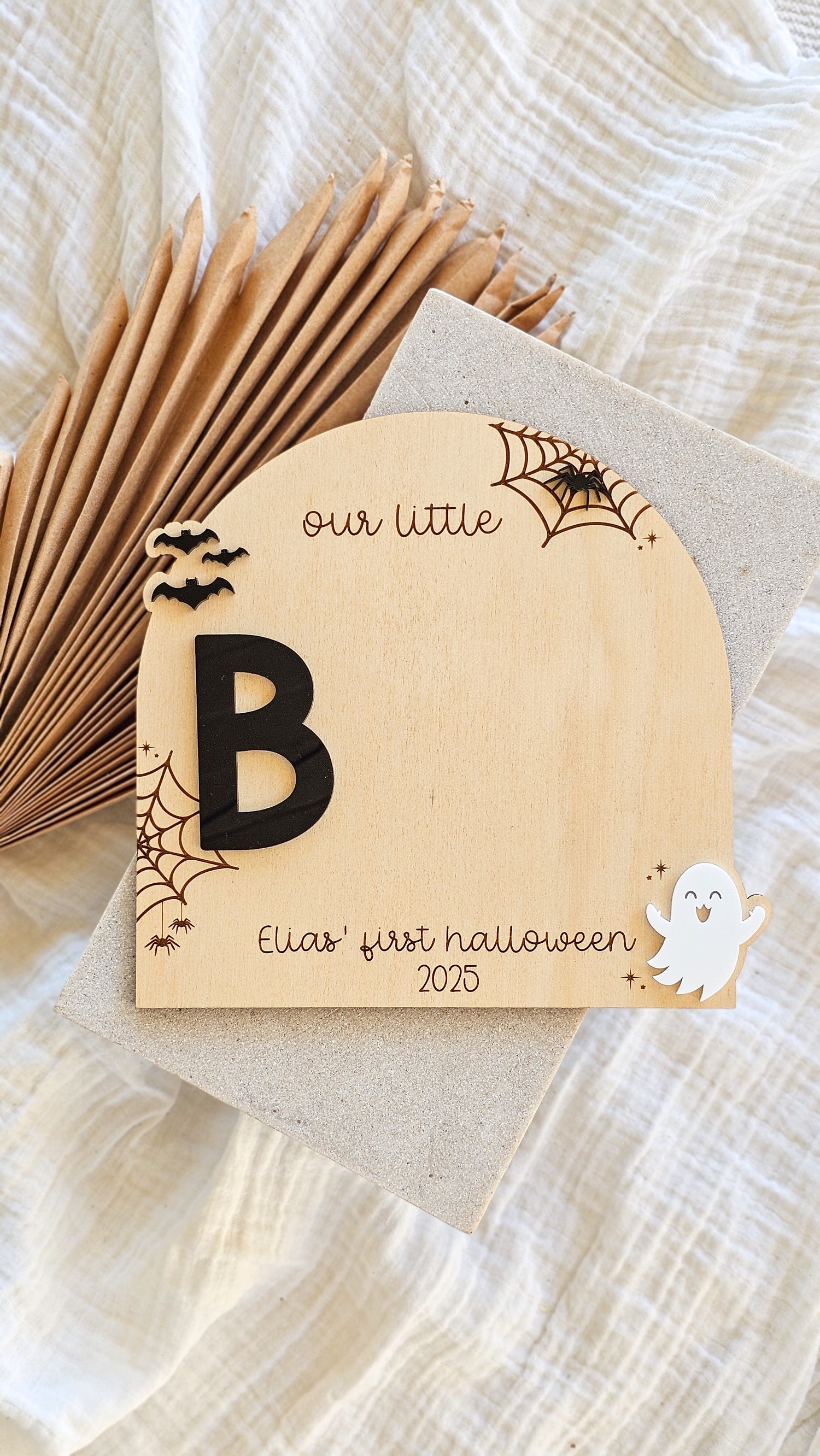 Celebrate your little one’s first spooky season with this adorable personalised Halloween sign. Featuring a sweet ghostly "Our Little Boo" design and spacing for you to add either hand or footprints, it’s the perfect keepsake to treasure your baby’s first Halloween.