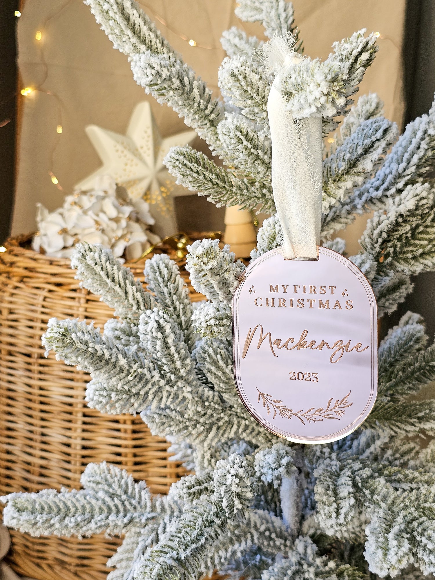 Mark your baby's first Christmas with this elegant Oval First Christmas Ornament. Crafted from robust plastic, this bauble is decorated with "My First Christmas" to make your tree special. Perfect for adding a special touch this holiday season.