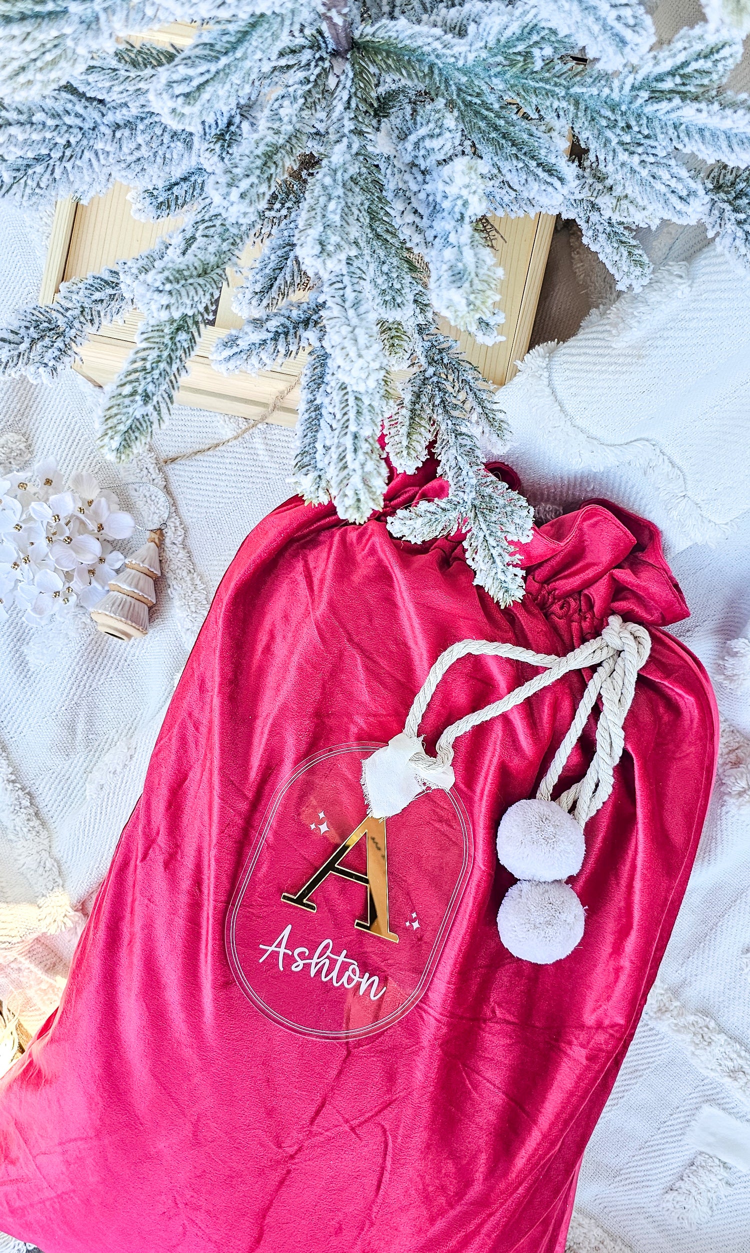 Featuring an acrylic letter, engraved name, on an oval ornament, completed with ribbon. A simplistic but stand out way to personalise your Christmas bag.