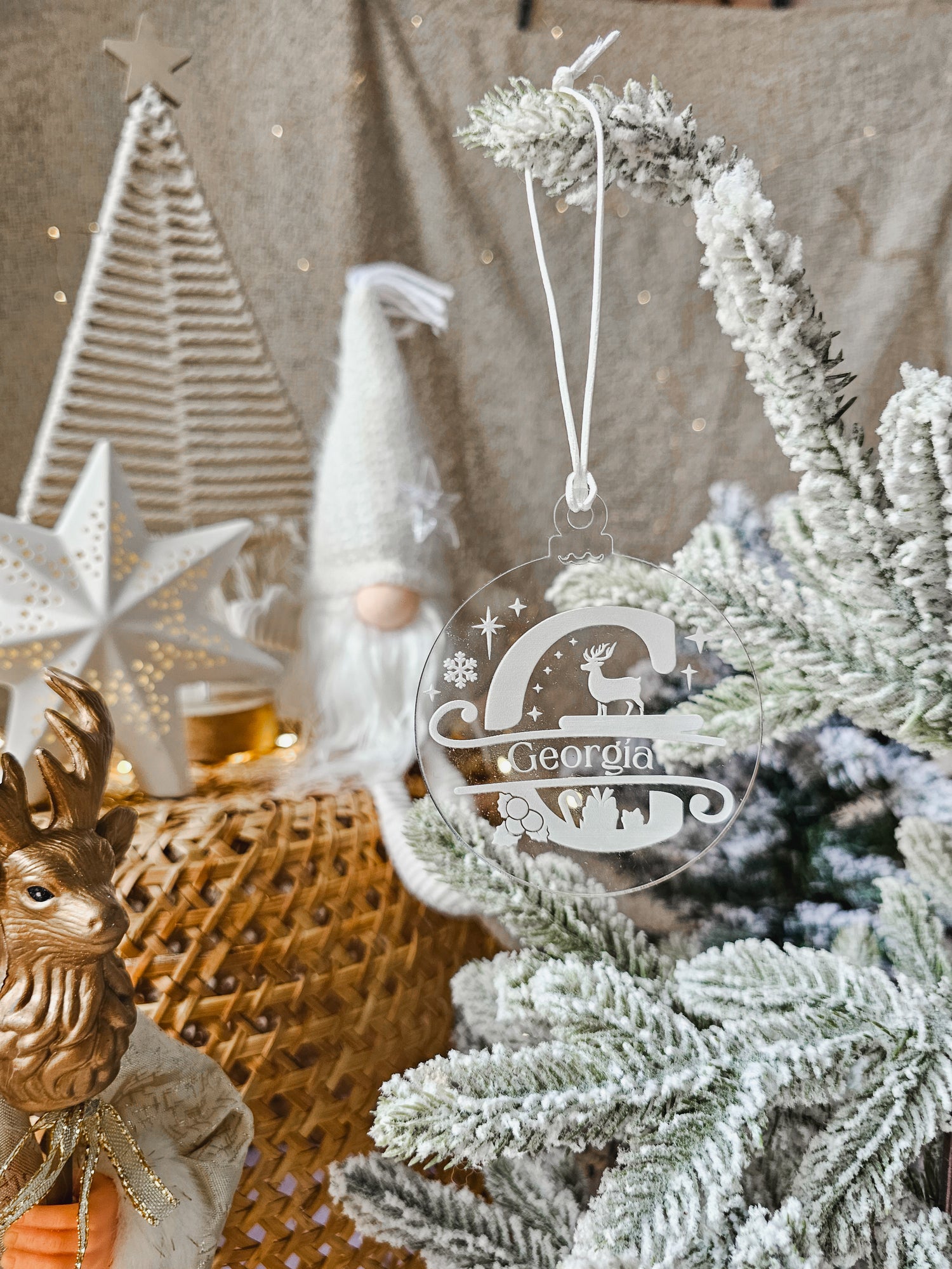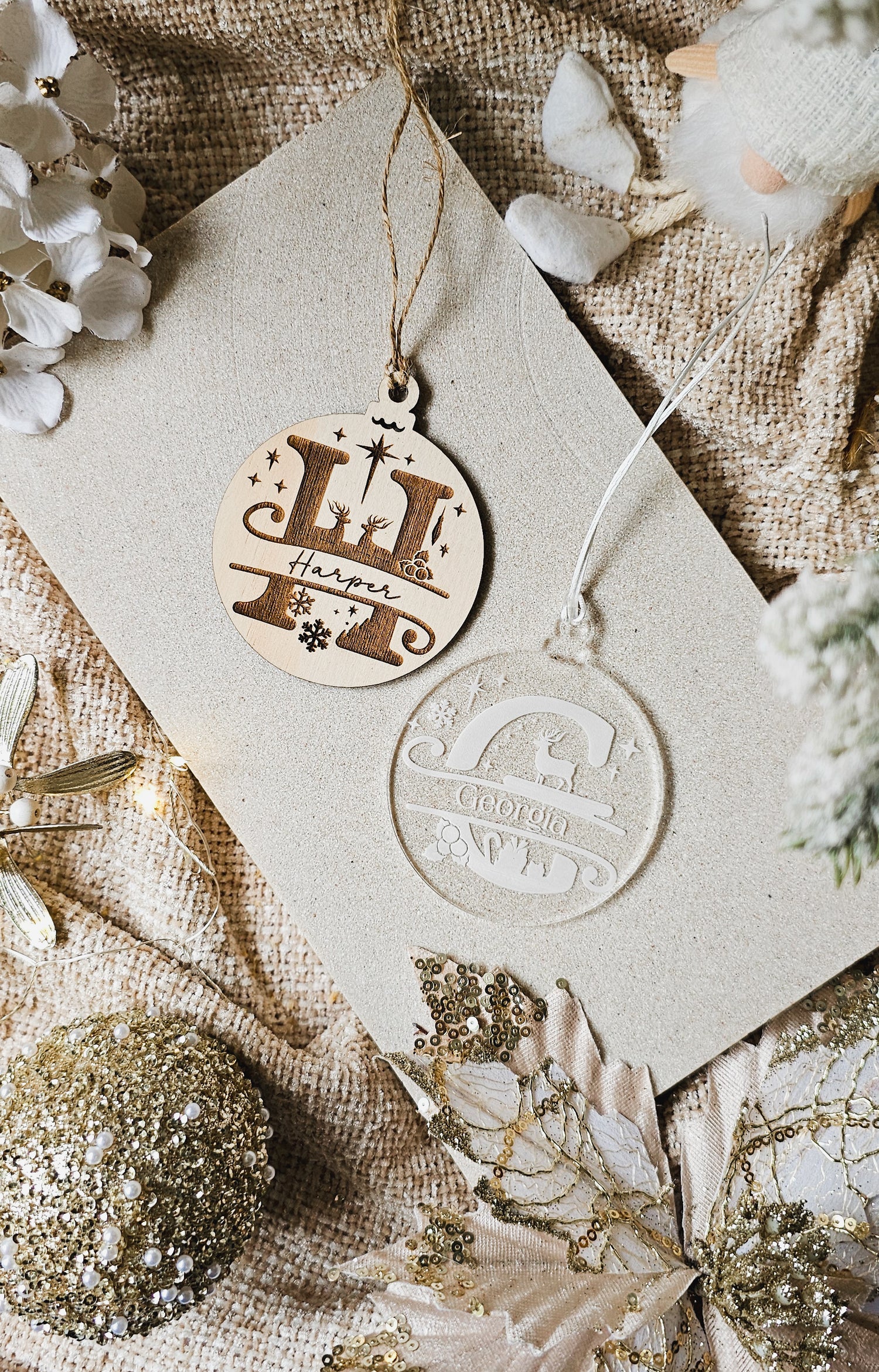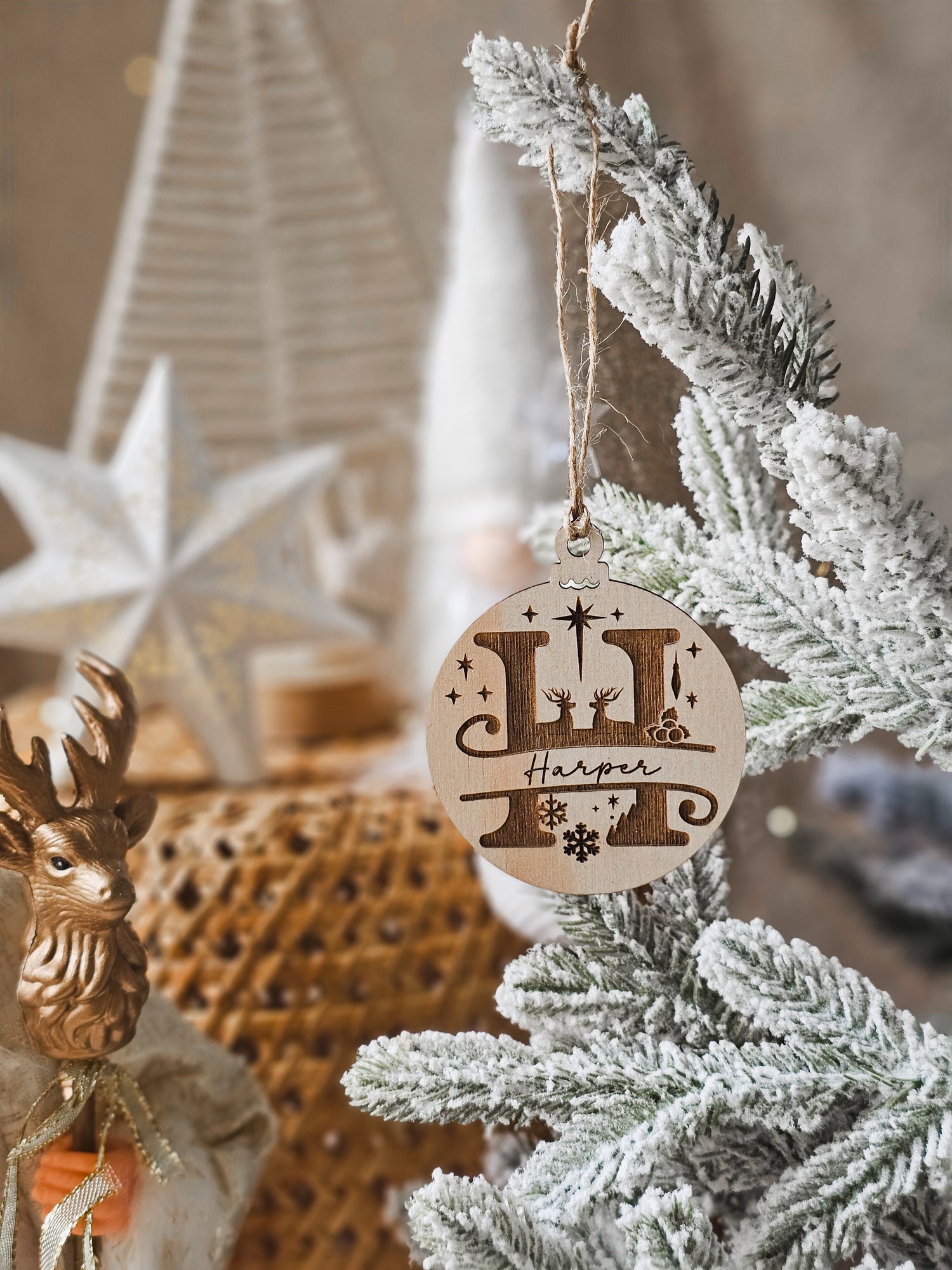 A special and personalised ornament to add to the Christmas tree. Each split monogram letter has a unique design and completed with your personalised name in the middle.