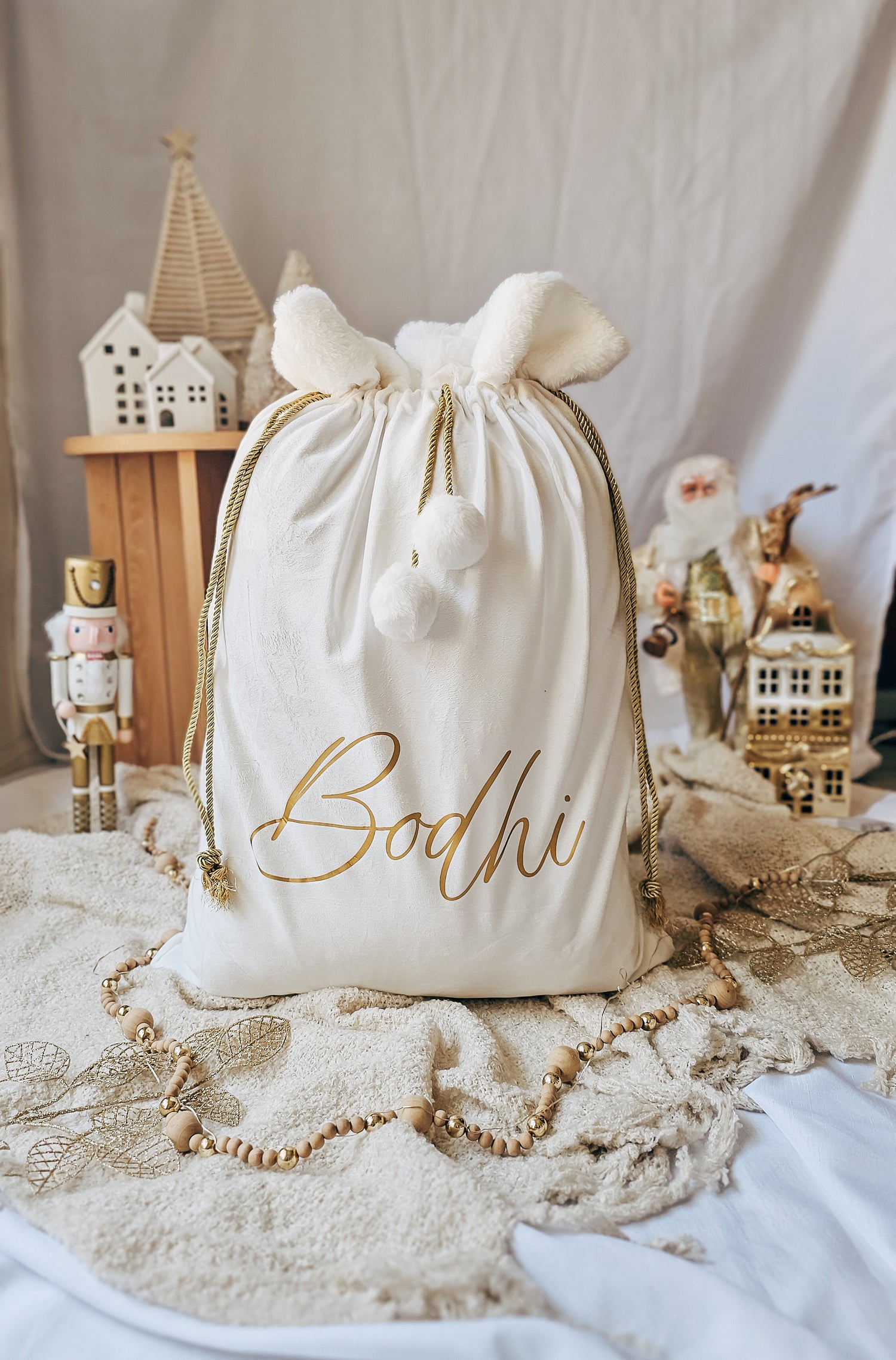 Our stunning deluxe velvet cream sack is made from quality, double lined velvet and completed with 2 adorable pom poms and gold drawstring. The Christmas sacks are made to a generous size, measuring 50x70cm. This is a different design to our other Christmas sacks with this sack sporting a fluffy faux fur trim.