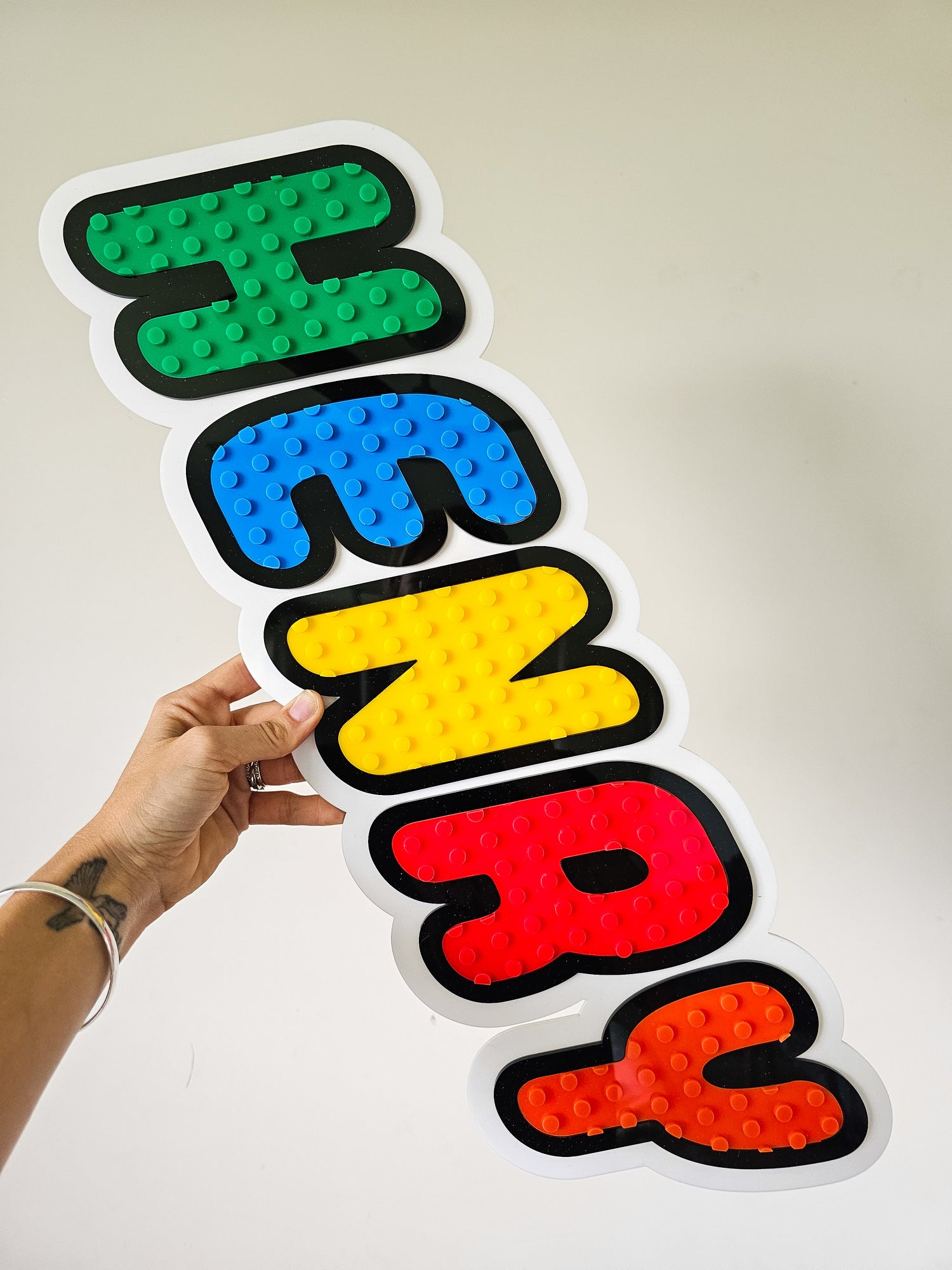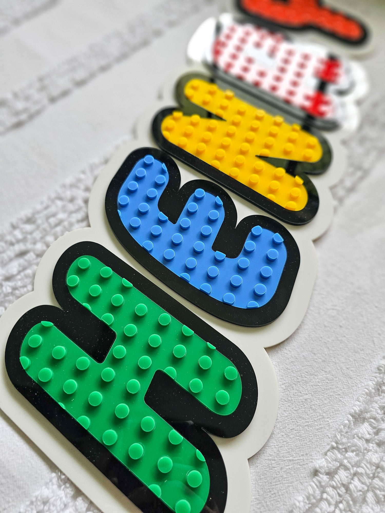 Replicating a lego brick, each letter will come with raised dots and come in the classic colours which are individually cut and stuck down. If the name is longer than 5 letters, we will repeat the pattern starting from green unless specified. You are welcome to choose any colourway you like, please find the colour choices in the photo library.