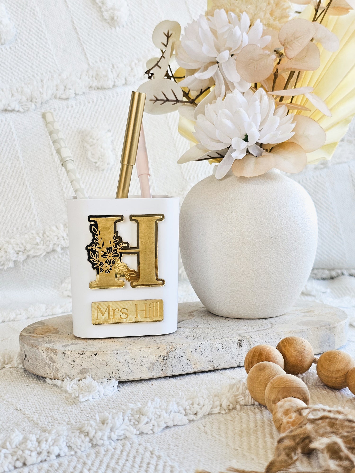 Our teacher pen cups make for the most perfect gift - totally practical but with an added personalised touch. Completed with an eye capturing floral letter and personalised name engraved from mirror acrylic which adds the perfect touch of uniqueness.