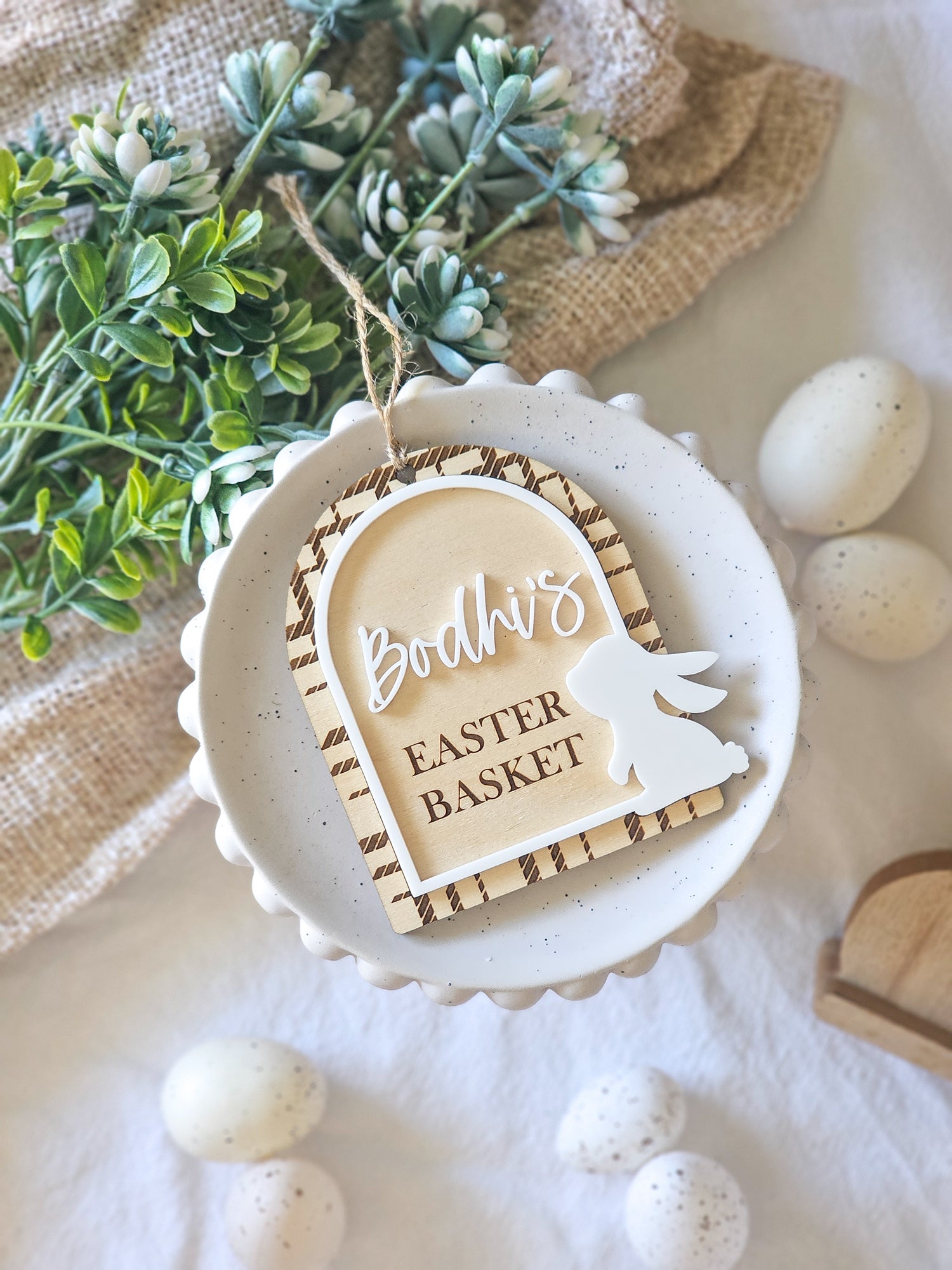 Hop into Easter magic with this delightful Easter tag! Featuring a gorgeous plaid tartan frame on plywood, and topped with an adorable bunny border, it's the perfect personalised touch for your festive celebrations. Each tag is customised with a name, making it an extra-special keepsake.