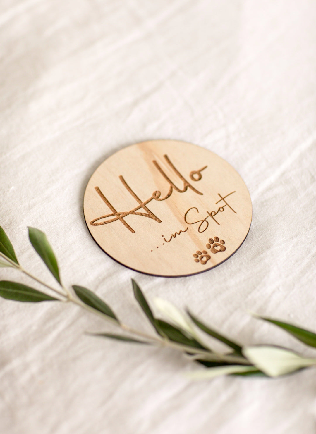 Welcoming a fur baby to the family? Announce his arrival with our sweet "Hello, I'm" timber engraved plaque.