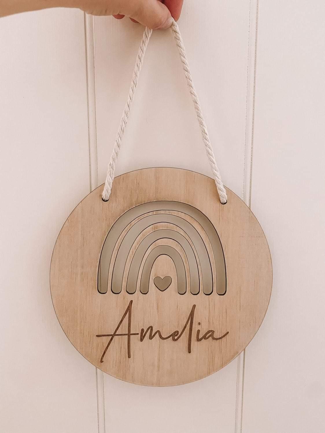 Featuring an engraved personalised name with cut out detailing, completed with jute rope. Available in a range of sizes