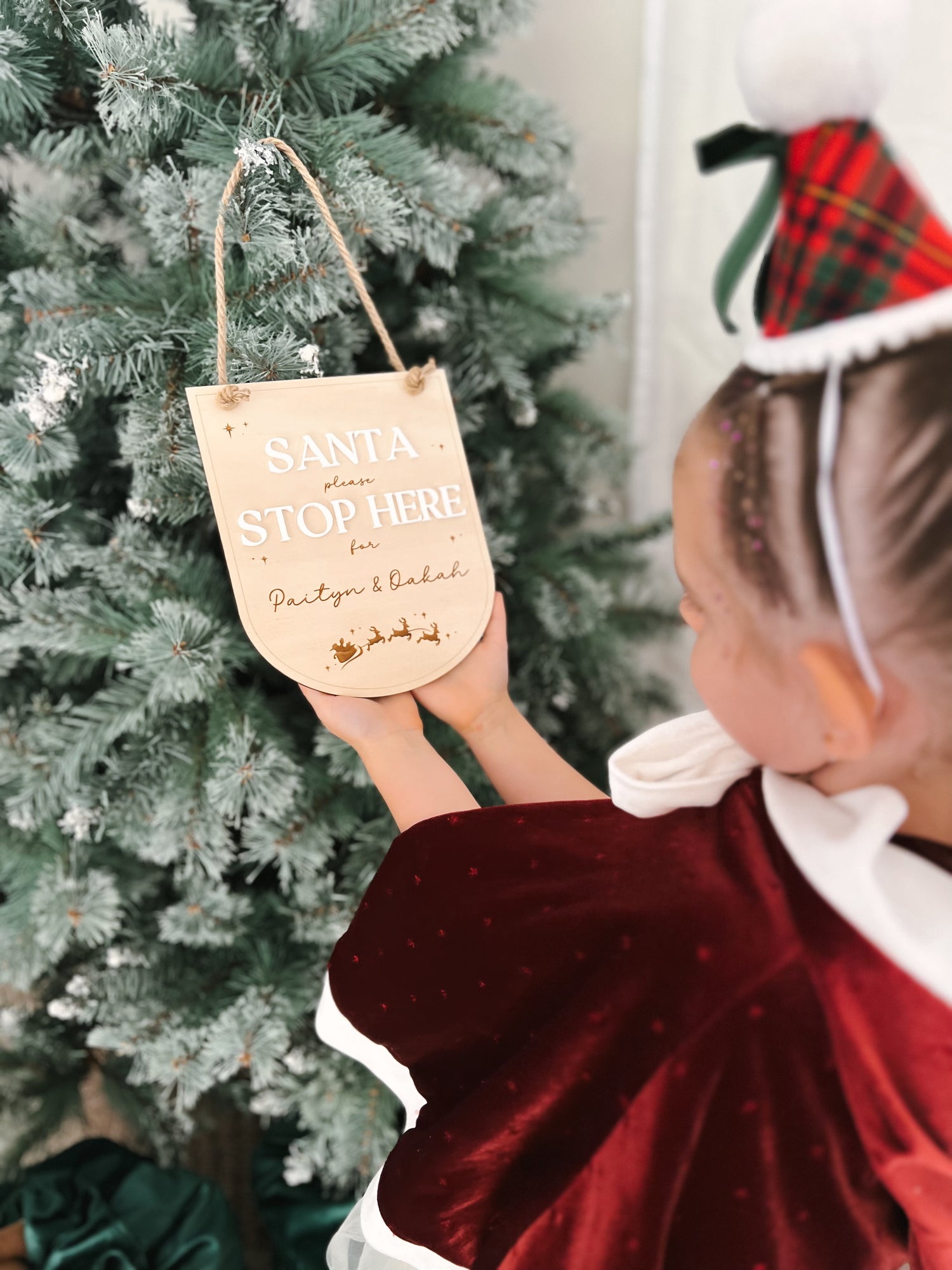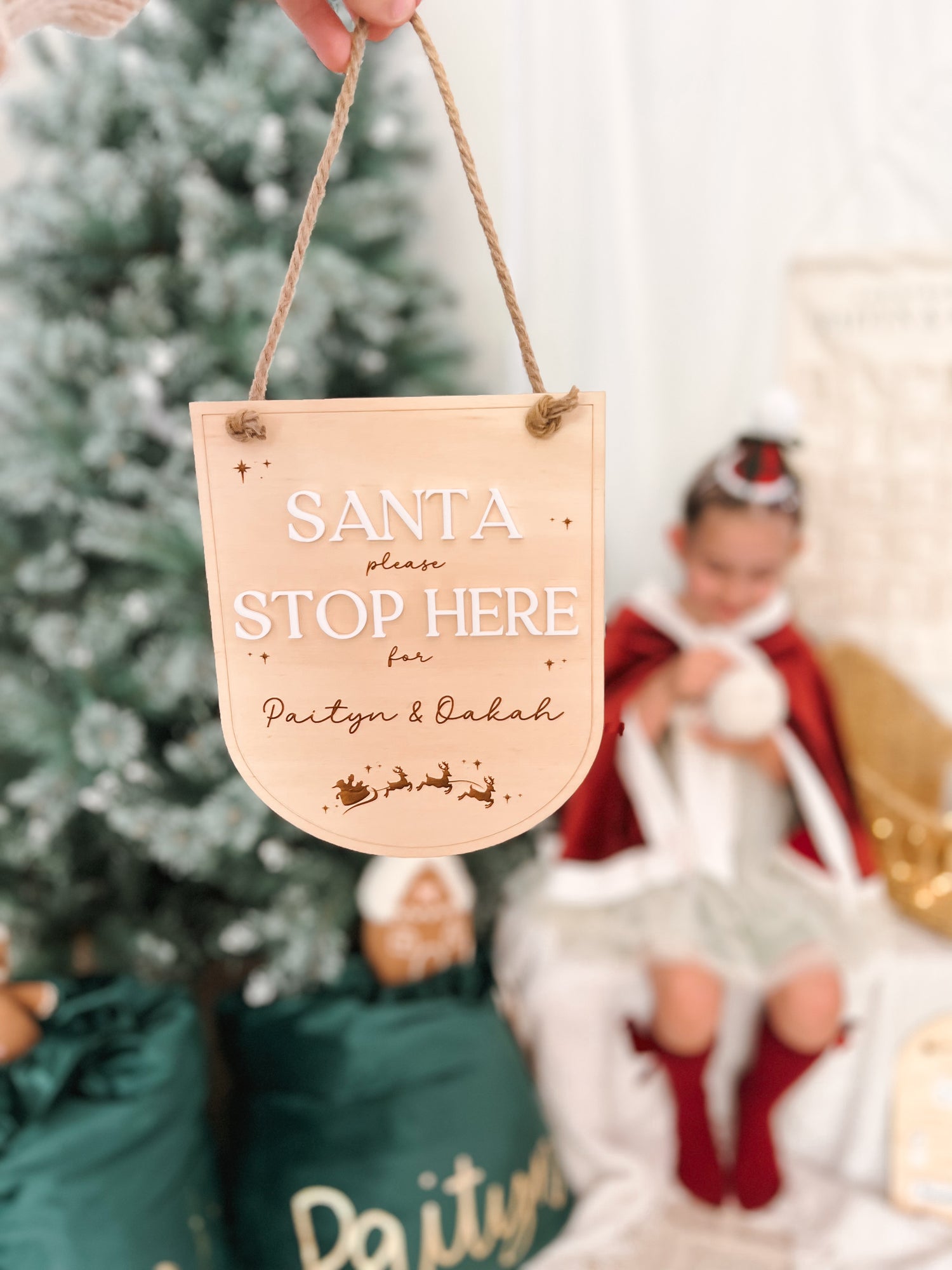 Let Santa know where to land with this personalised "Santa Please Stop Here" plaque made from timber and acrylic. No need to shout, just hang it on your door and the jolly man in the sleigh will know exactly where to stop!