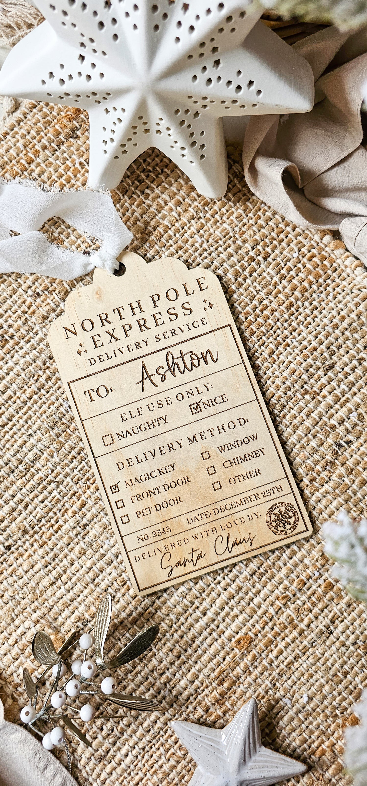 Our Santa delivery tag is the perfection addition of magic on Christmas morning. Picture your little one running to their sack and to find Santa's tick of approval.