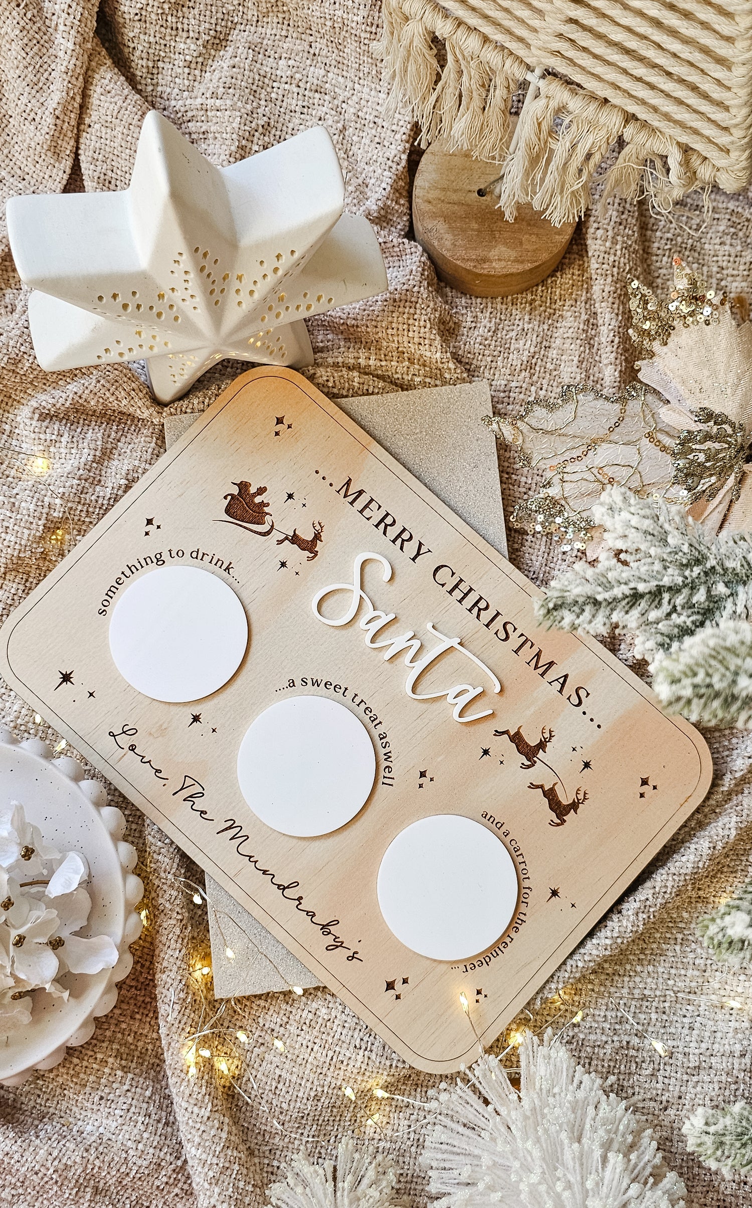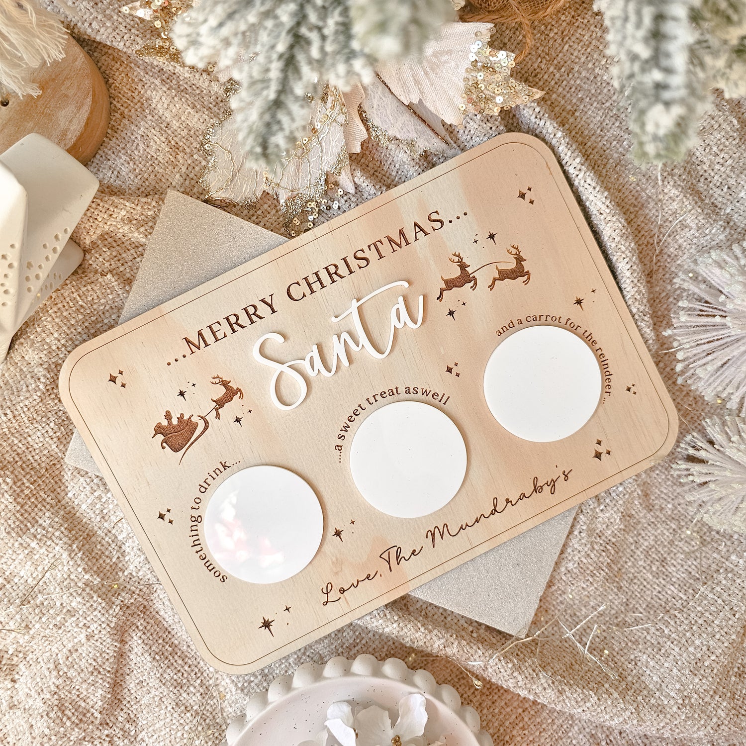 Our treat board is made from a mixture of engraved plywood and acrylic. Personalise the board with your children's or family's name. You may opt to change the wording from 'Merry Christmas' if you wish.