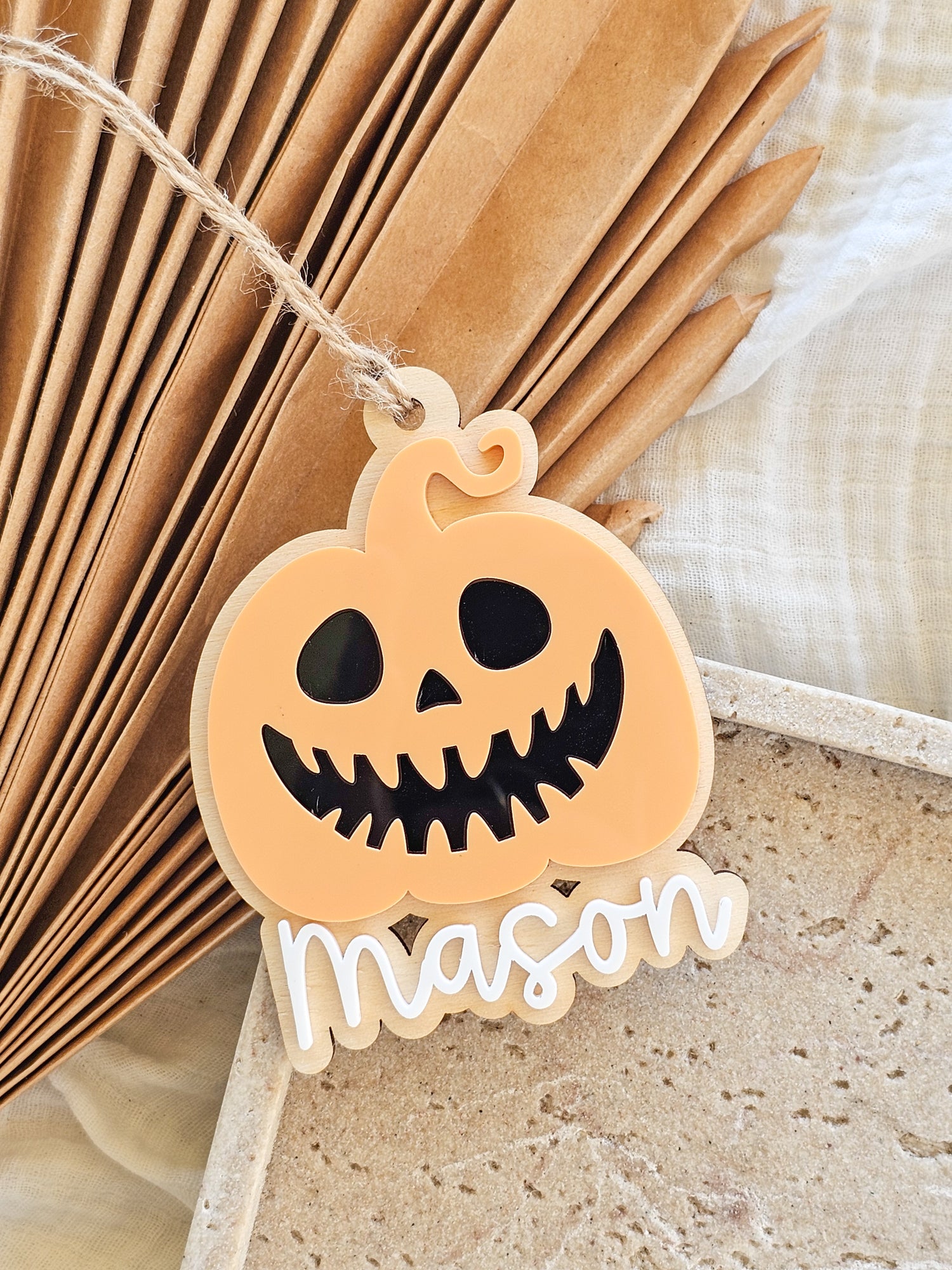 Give your Halloween gifts a charmingly spooky vibe with this cute but scary pumpkin tag. Personalised with a name, it blends playful fright with festive fun. Perfect for adding a pop of personality and Halloween spirit to any treat or surprise.