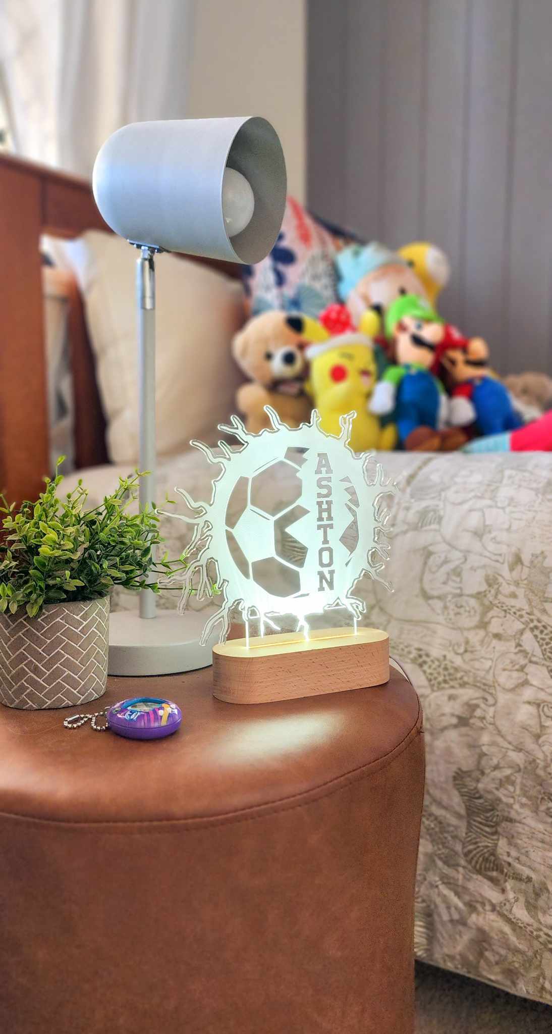 A fun design show casing a flying soccer ball and name displayed vertically.