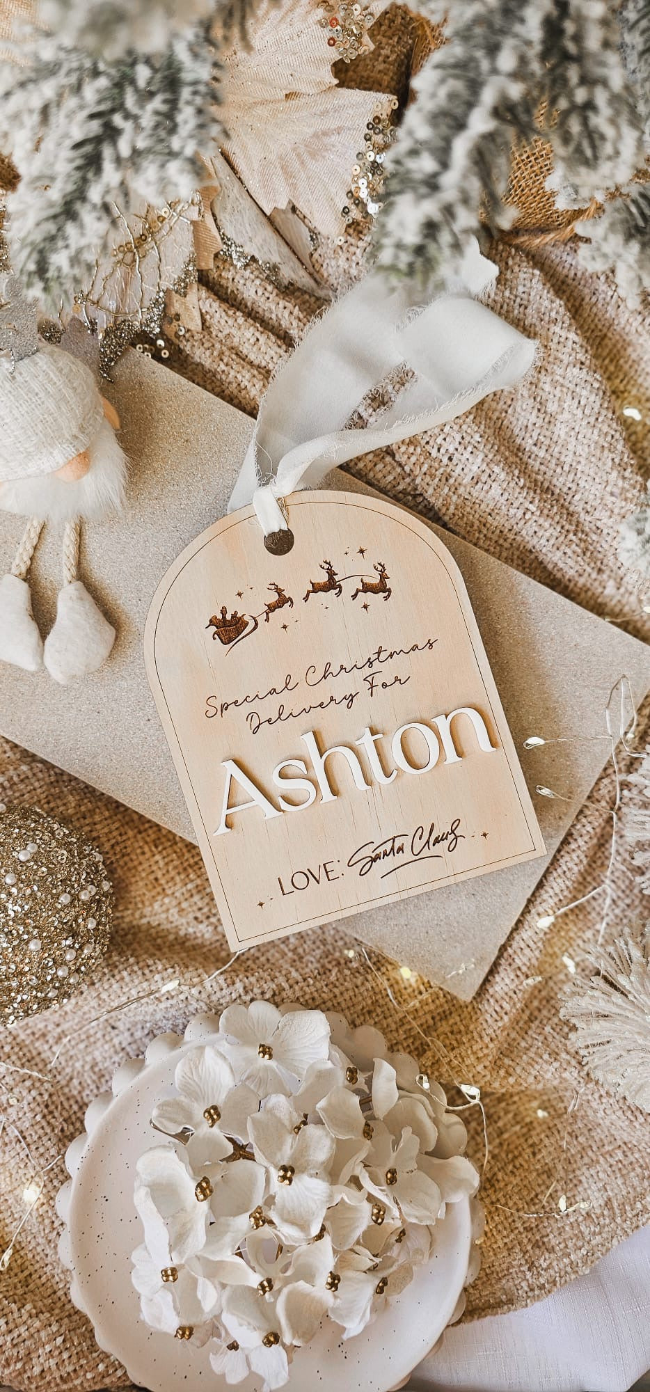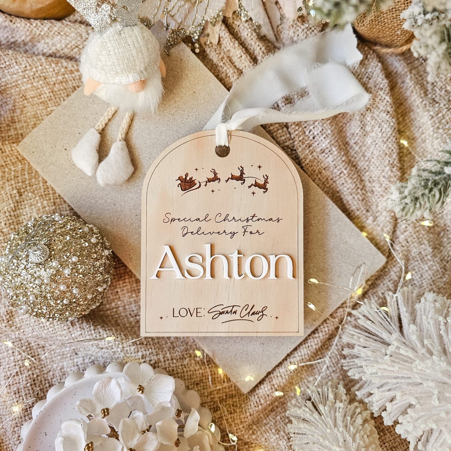 Featuring Santa's sleigh, delivery message, personalised name in acrylic and finished off with Santa's signature. A perfect personalised addition to your child's Christmas bag.