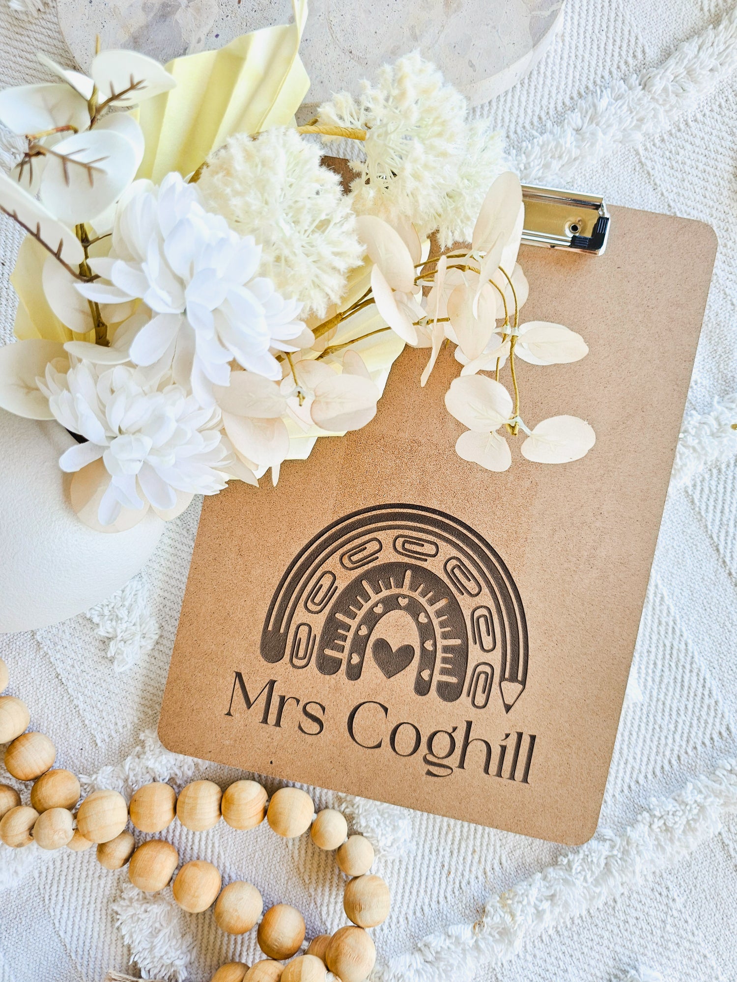 This personalised clipboard is a practical and playful gift for any teacher. With a rainbow design and custom engraving, it adds a touch of fun to any classroom. Give your teacher something unique and useful with this rainbow clip board.