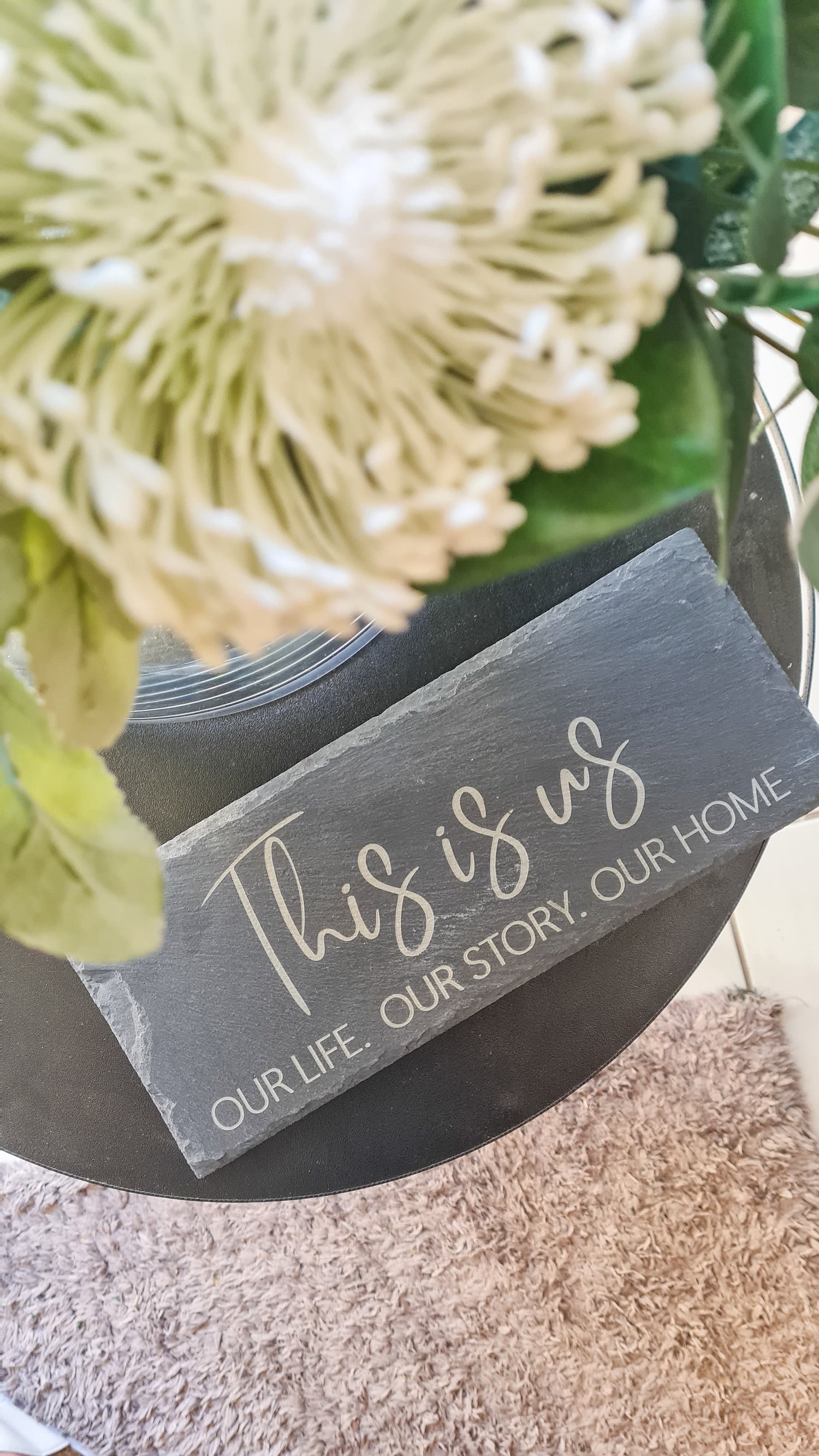 Design features the title 'This is us' with 'our life, our story, our home' 30x11cm slate tile.