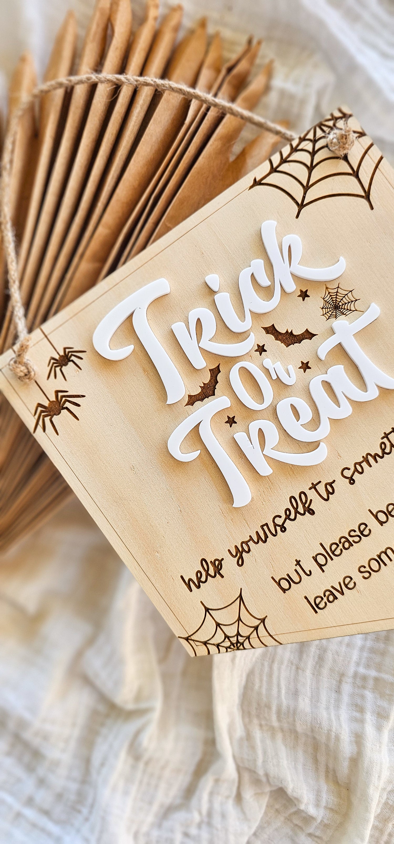 Invite your Halloween visitors with this playful "Treat or Treat - please help yourself" sign. It's the perfect way to welcome guests warmly while sharing the fun spirit of giving. The special message encourages everyone to be kind and leave some treats behind, making sure the Halloween magic continues for all who stop by.