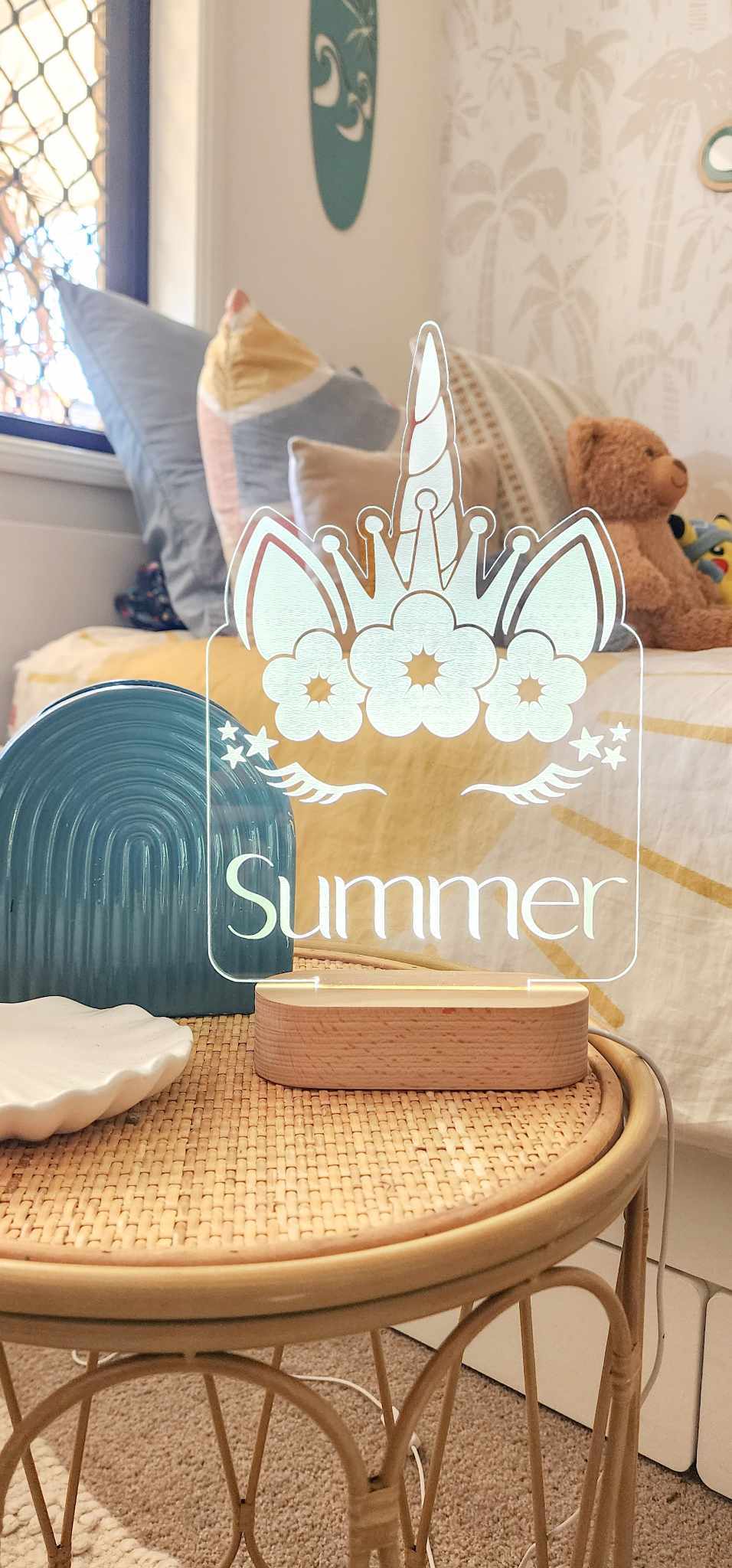 For the unicorn loving little ones! This design features a stunning crown wearing unicorn with gorgeous lashes and completed with personalised name. The perfect addition to bedside table or shelf. *