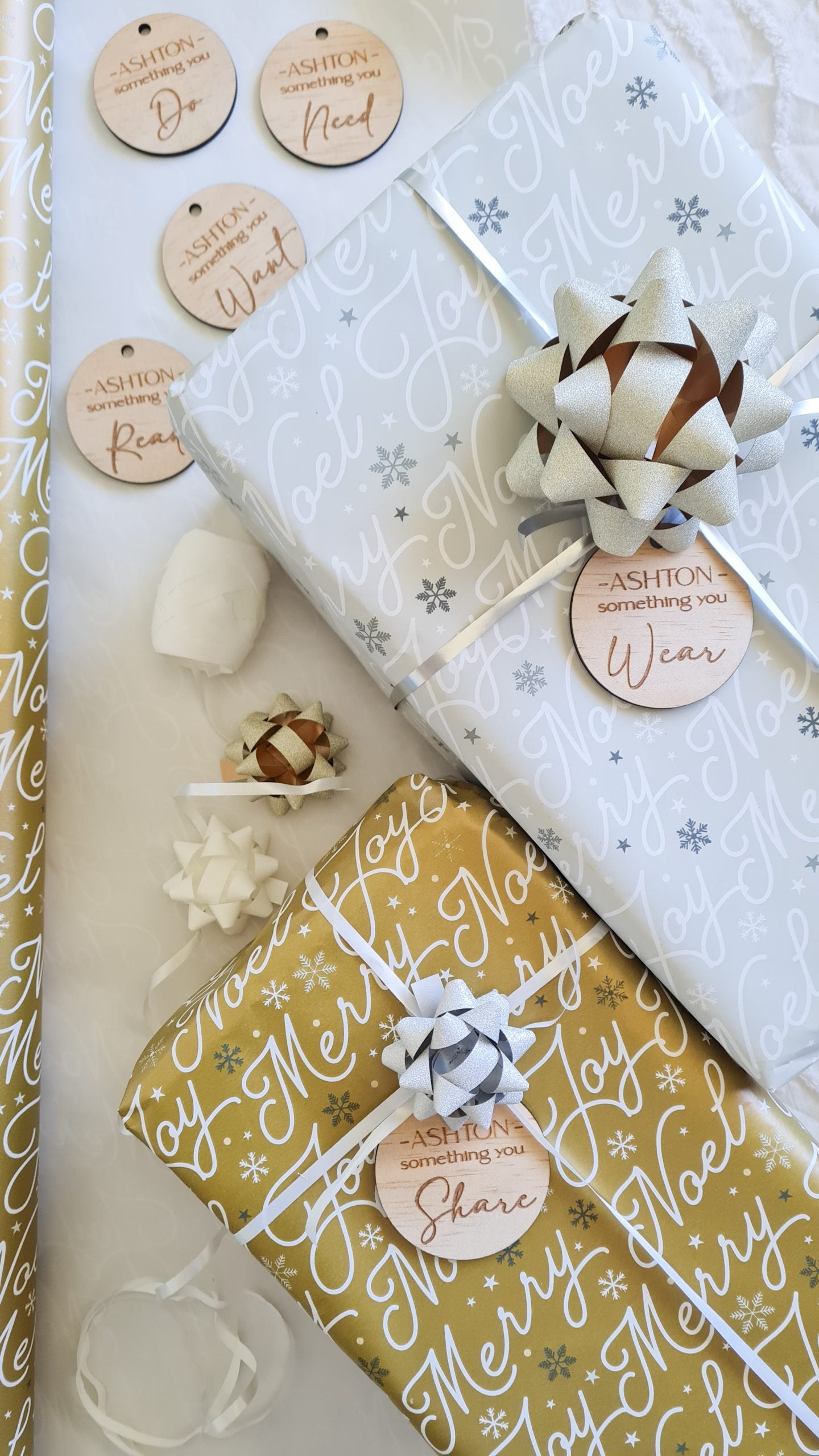 Want, Wear, Need, Read, Share, Do Round Christmas Wooden Tags