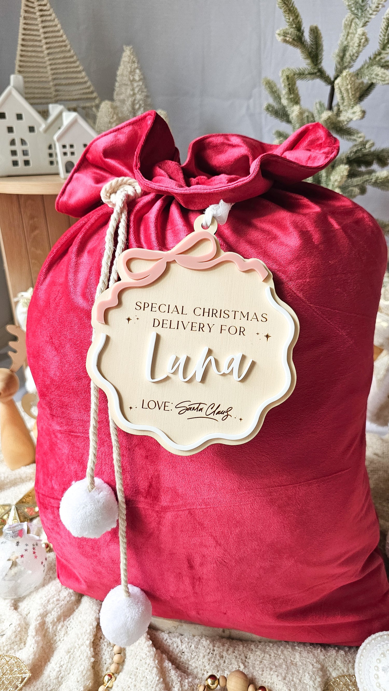 Add a touch of fun to your gift wrapping with this Wavy Bow Christmas Sack Tag. Featuring a charming wavy shape and a large playful bow, it’s personalized with your chosen name and Santa’s signature for that extra special delivery feeling. Perfect for making your Christmas Sack stand out under the tree!