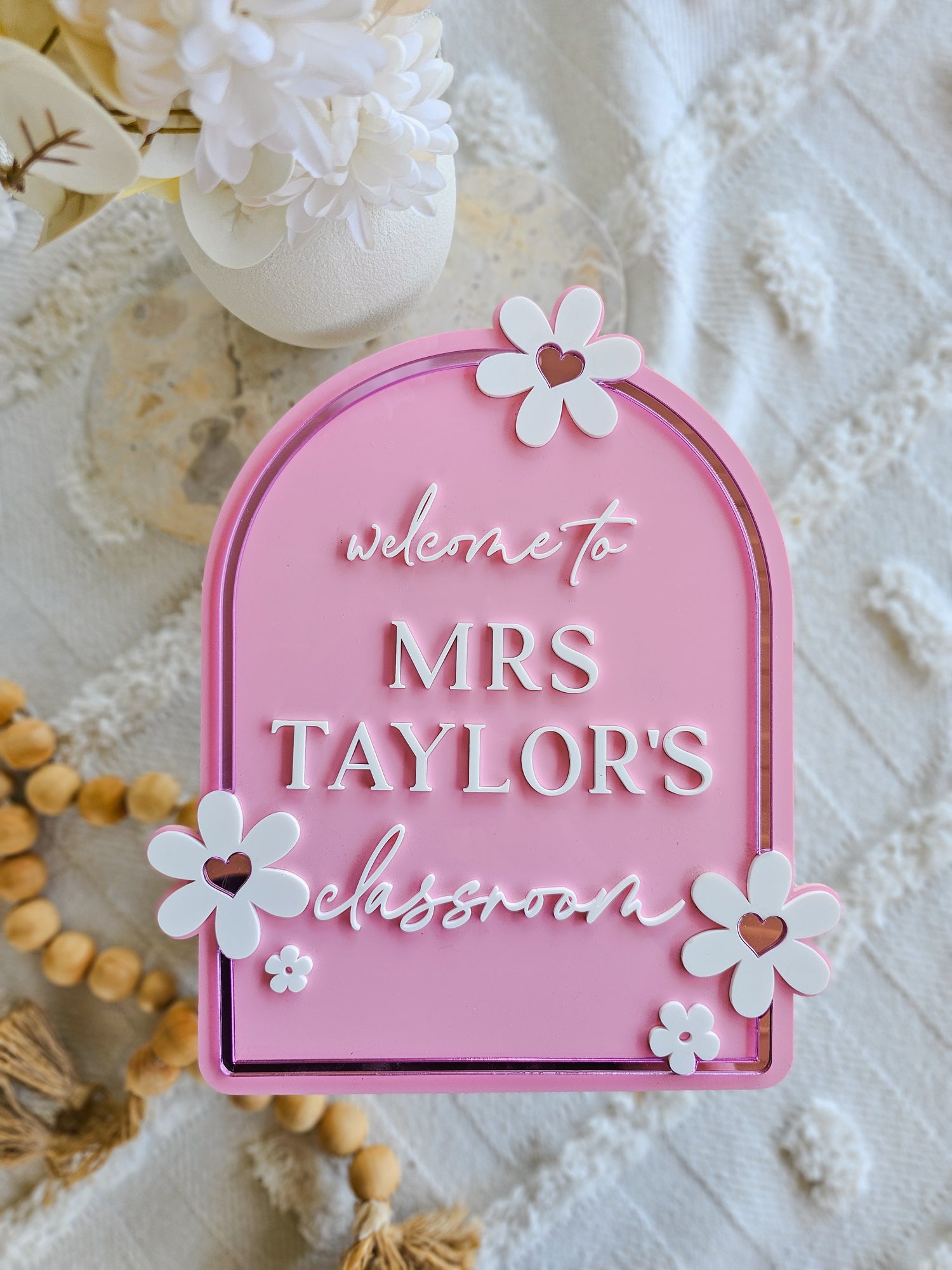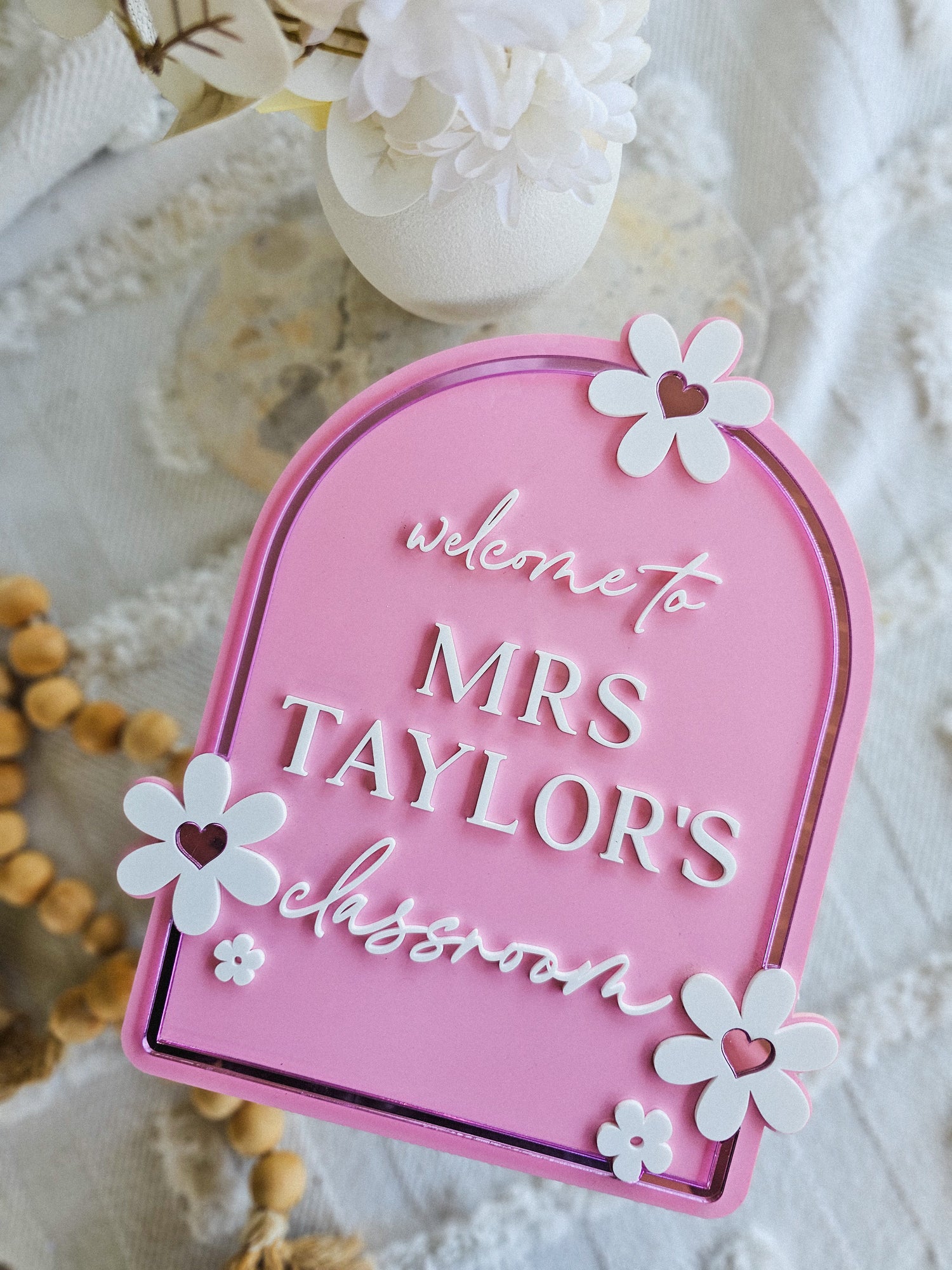 Welcome your students with this personalized daisy-themed plaque! Made from acrylic with a mirrored border, it's sure to add a touch of elegance to any classroom. Plus, customize it with your teacher's name for an extra special touch. A must-have for any fun-loving educator.
